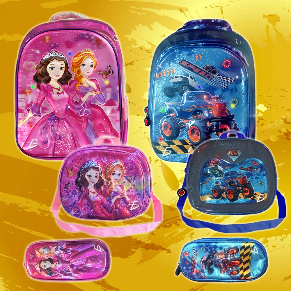 Set de Mochila de Princesa y Coches Escolar con Lapicera y Lonchera Térmica con Luces Leds RGB .Las luces leds se prenden al contacto con estampados de moda ideales para que tus pequeños brillen en el colegio.