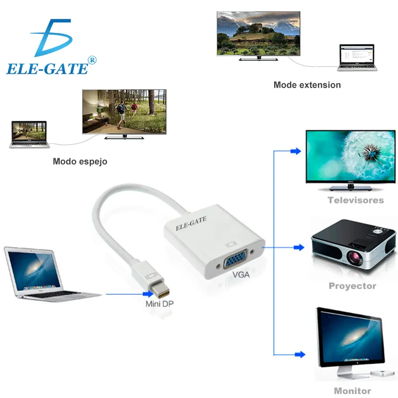 Cable adaptador de mini displayport a vga, para Mac apple ideal para conectar tu Macbook, Macbook Pro o Macbook Air a un monitor de PC con entrada VGA, SVGA, SXGA, UXGA. Esta entrada es usual también en proyectores. Puedes usar también una pantalla externa como tu espacio de trabajo principal o para extender tu escritorio o puedes trabajar en un modo espejo con un proyector.