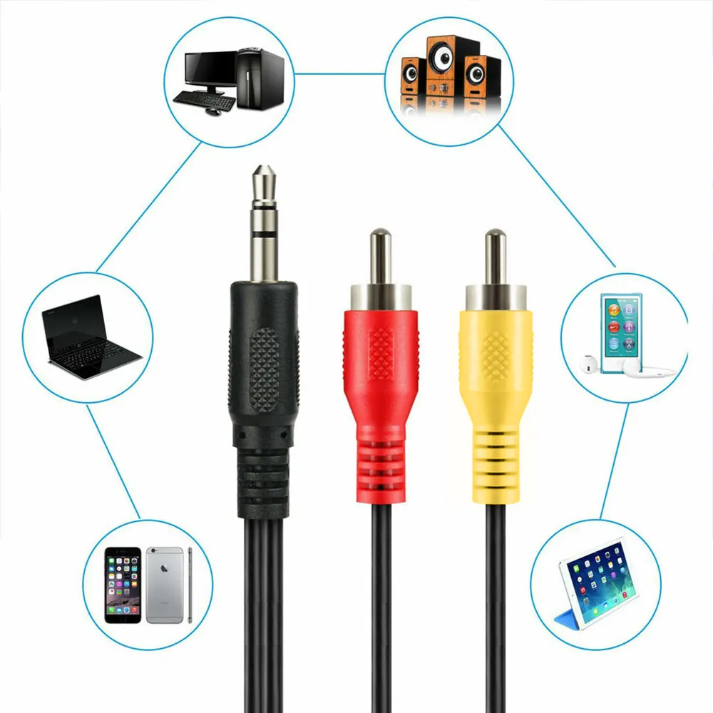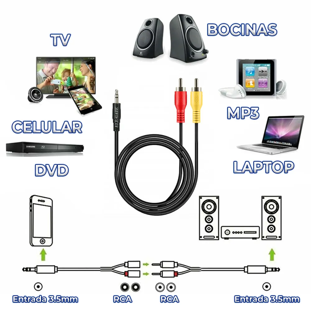 - Compatibilidad versátil: Convierte la salida de audio de 3.5mm en una salida dual de audio RCA, lo que permite la conexión de una amplia gama de dispositivos, como teléfonos inteligentes, tabletas, reproductores de música, computadoras, entre otros, a equipos de audio con entradas RCA.