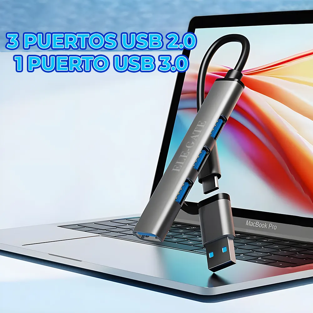 Adaptador HUB 4 USB con entrda Tipo C y adaptador USB 3.0. Diseñado para mejorar la conectividad de tu laptop u ordenador, este accesorio versátil y compacto permite ampliar las entradas USB de forma eficiente. Cuenta con 1 puerto USB 3.0 de alta velocidad para transferencias rápidas de datos y 3 puertos USB 2.0 para conectar múltiples dispositivos como teclados, ratones, memorias USB e impresoras. Compatible con una amplia variedad de sistemas operativos, garantiza máxima compatibilidad y rendimiento estable. Su diseño portátil y ligero lo hace ideal para uso en casa, oficina o viajes.