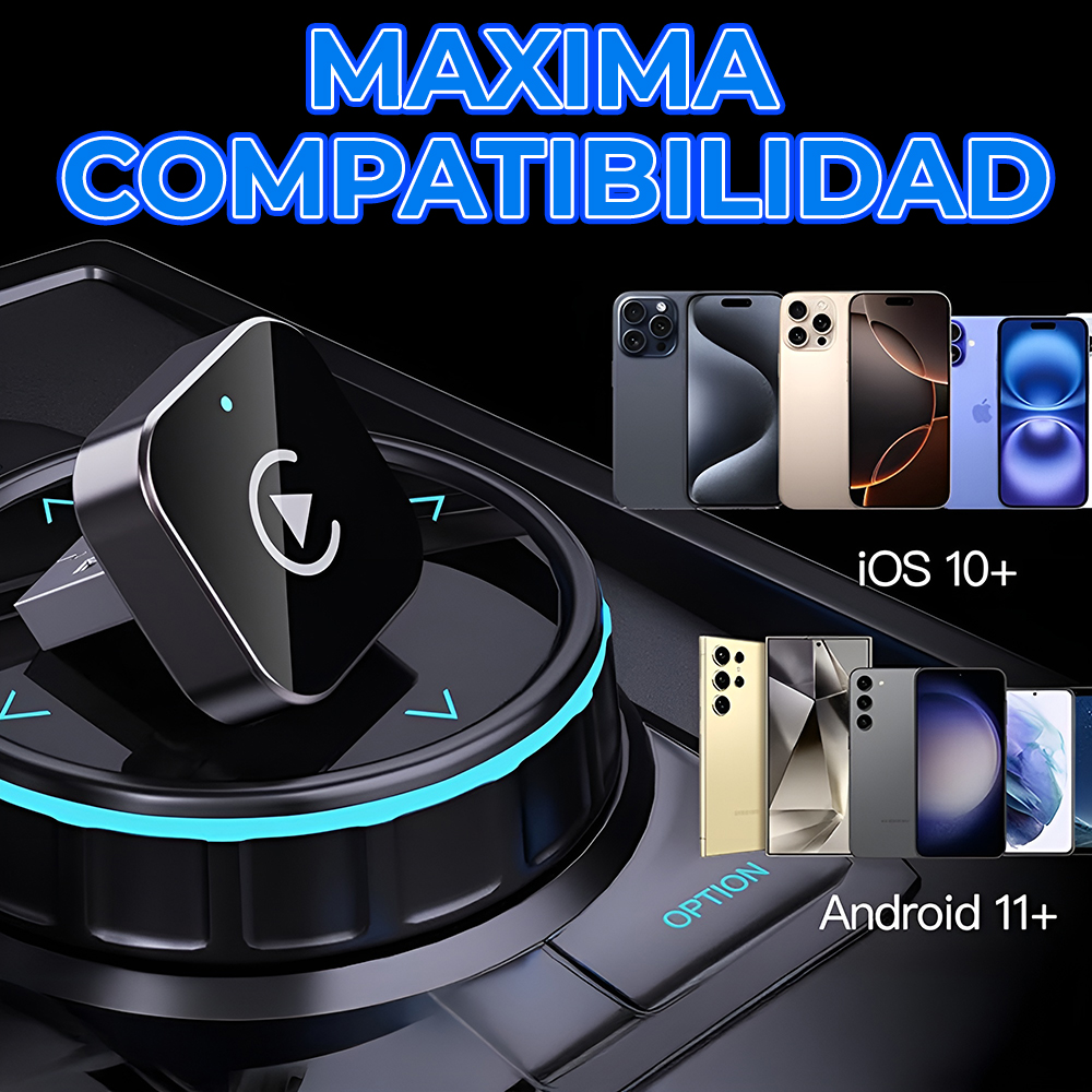 Convierte tu CarPlay o Android Auto con cable en totalmente inalámbrico en segundos. Disfruta de una experiencia más limpia, moderna y sin cables molestos dentro de tu vehículo.