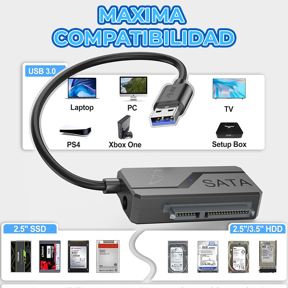 El Adaptador SATA a USB 3.0 con alimentación permite conectar rápida y fácilmente discos duros SSD/HDD de 2.5 pulgadas y HDD de 3.5 pulgadas directamente a tu computadora o laptop.