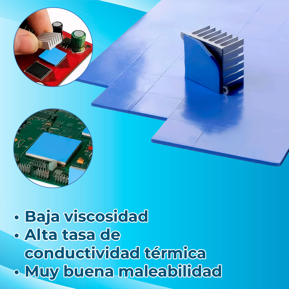 Con una conductividad térmica de 2 W/m·K, asegura un contacto óptimo entre la fuente de calor y el disipador, reduciendo diferencias de temperatura en la superficie. Además, ofrece propiedades aislantes, estabilidad a largo plazo y absorción de sonido.