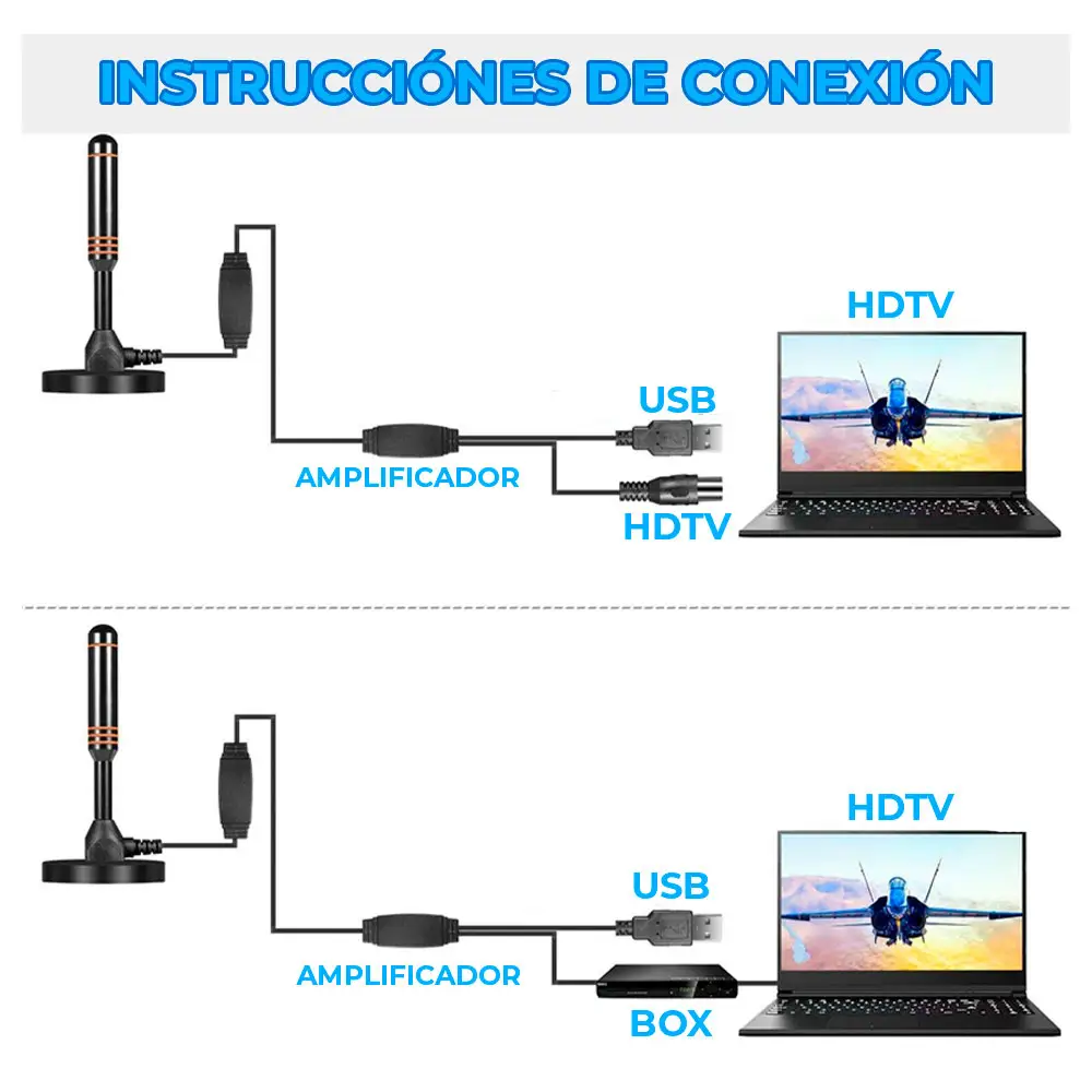 La antena HDTV interior puede alcanzar hasta 130 millas y puede colocarse en casi cualquier lugar de su hogar. Cuelga la antena interior en una ventana o pared, o mejor posición donde posea mejor recepción de tu casa. Si no se puede recibir una señal con el amplificador, mueva el amplificador de antena y vuelva a intentarlo.