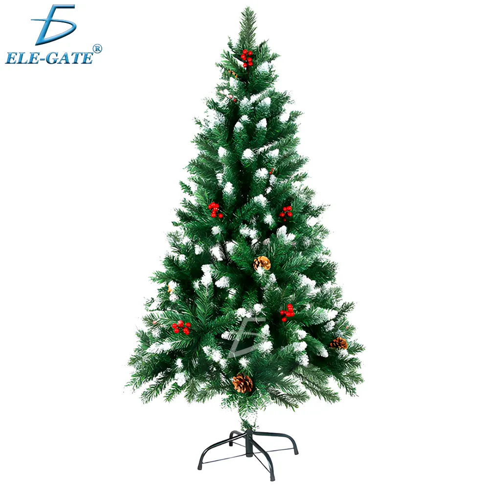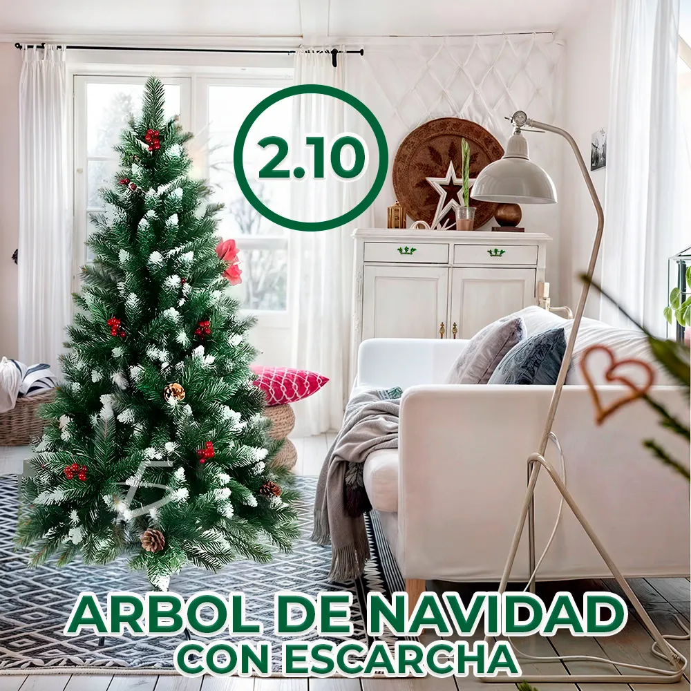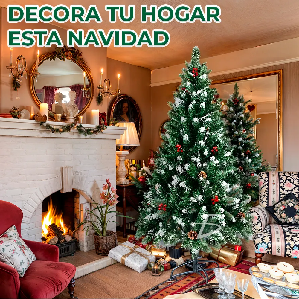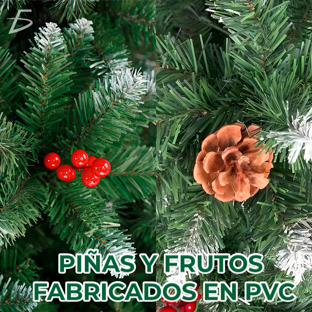 Árbol de Navidad Artificial 210m Verde con Efecto Nevado, Piñas y Frutos Rojos. Ideal para llenar de festividad tu hogar, oficina o lugar favorito.