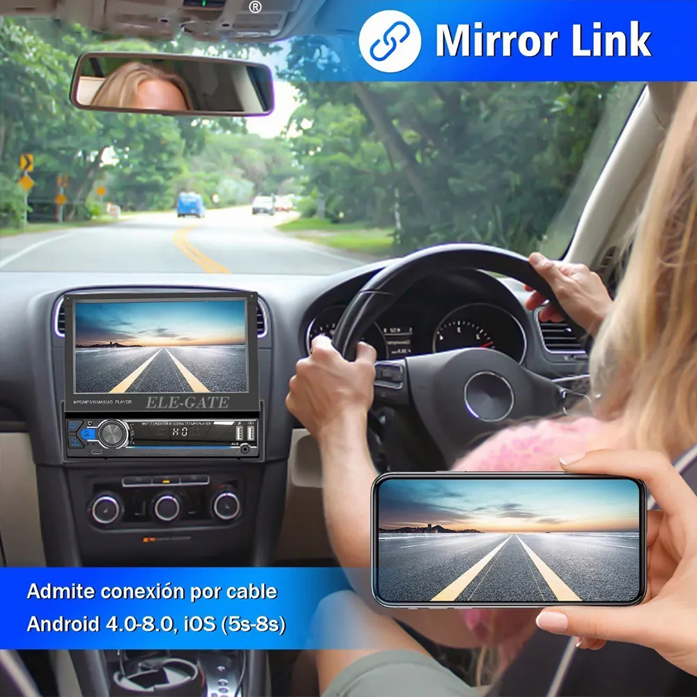 Autoestéreo 1DIN con Mirrorlink, Pantalla Táctil Retráctil HD de 7 pulgadas, GPS y Soporte Multilingüe.