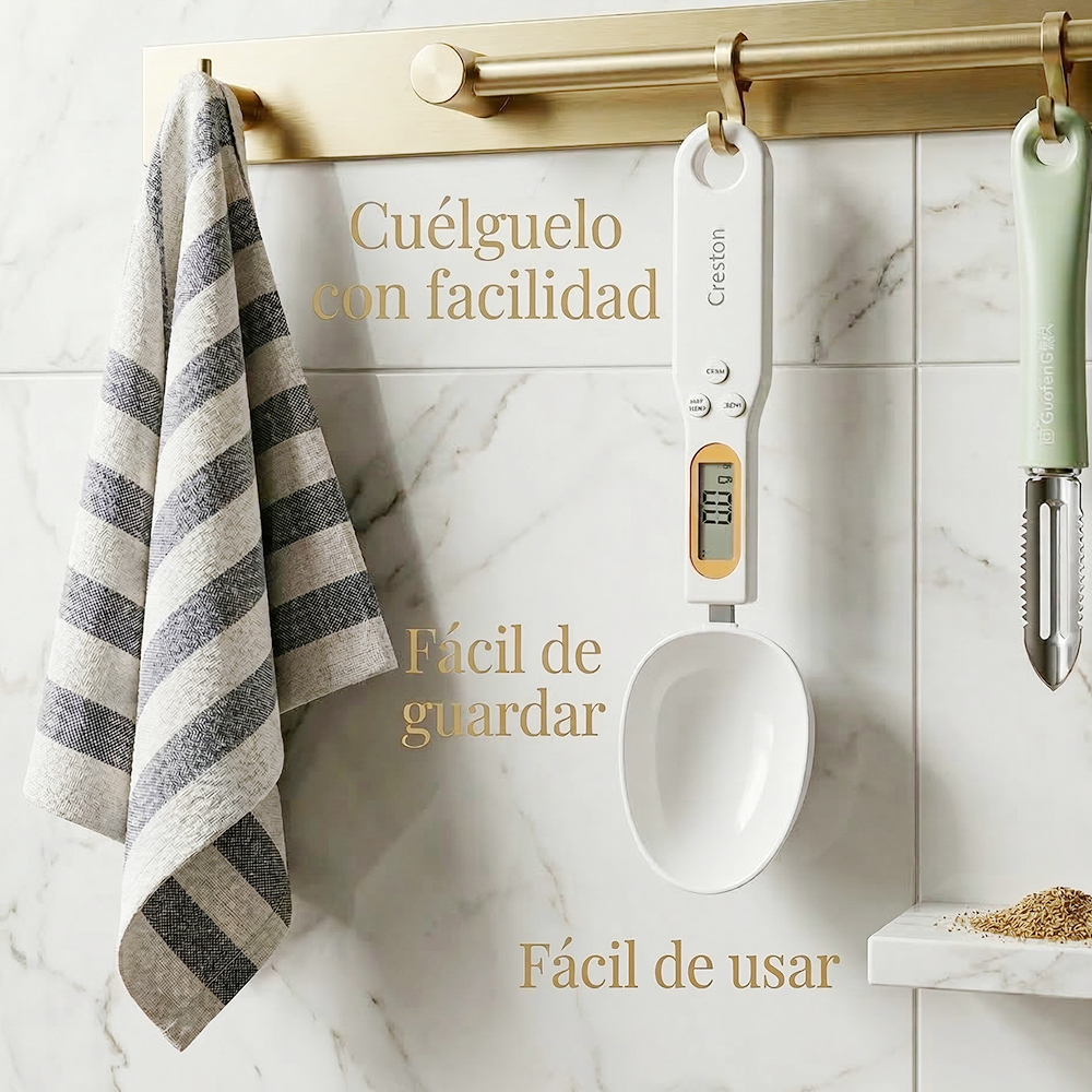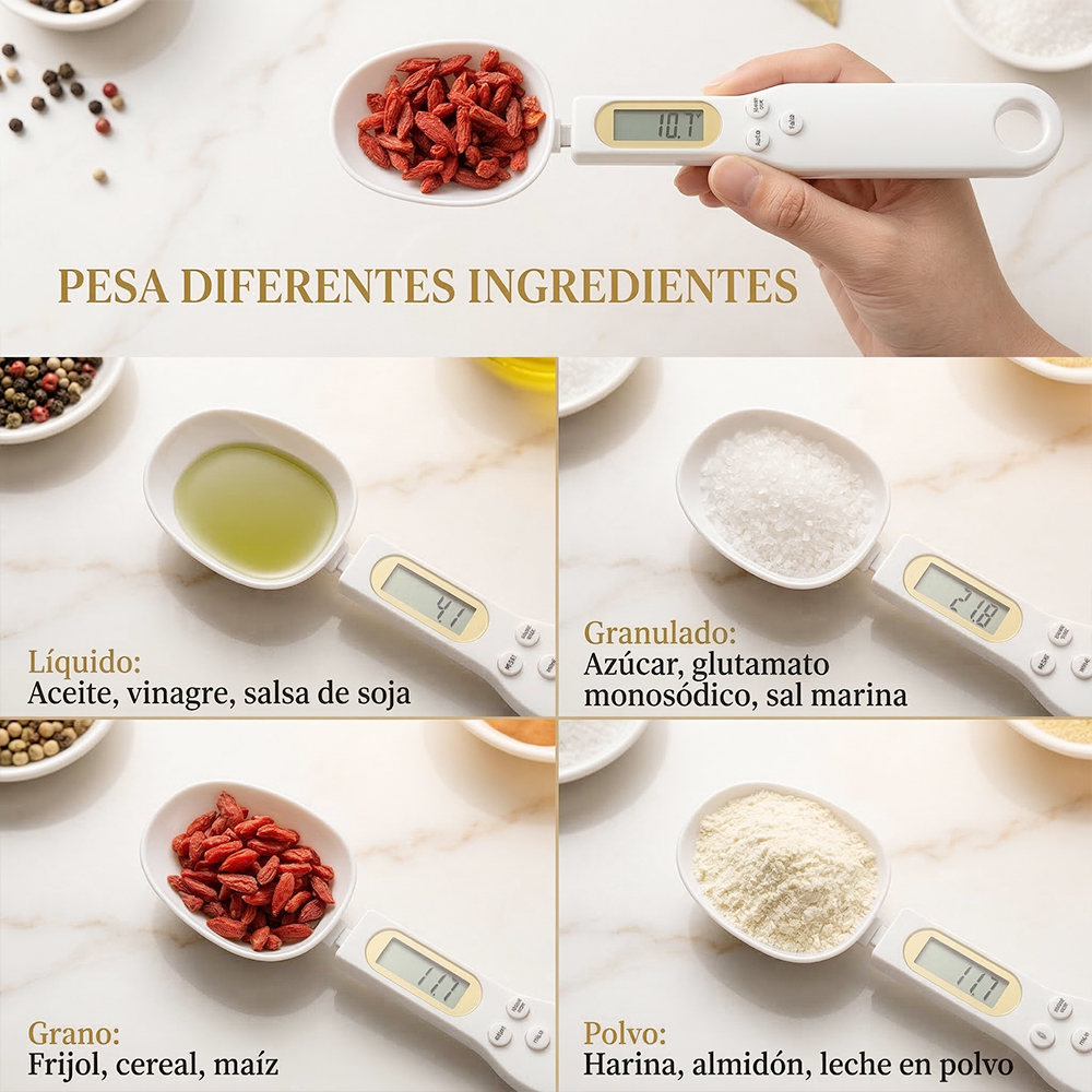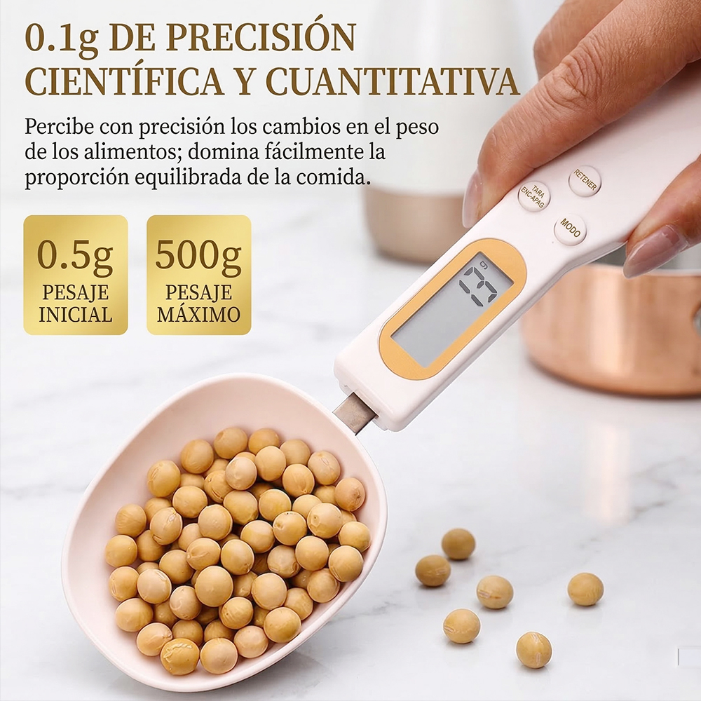 Esta báscula digital tipo cuchara ofrece mediciones exactas desde 0.1 gramos hasta 500 gramos, ideal para recetas que requieren precisión como repostería, café, té, especias y suplementos.