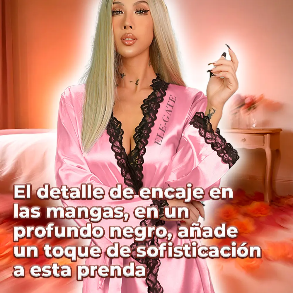Bata de Satén de Seda con Mangas y Cuello de Encaje con cinta de ajuste