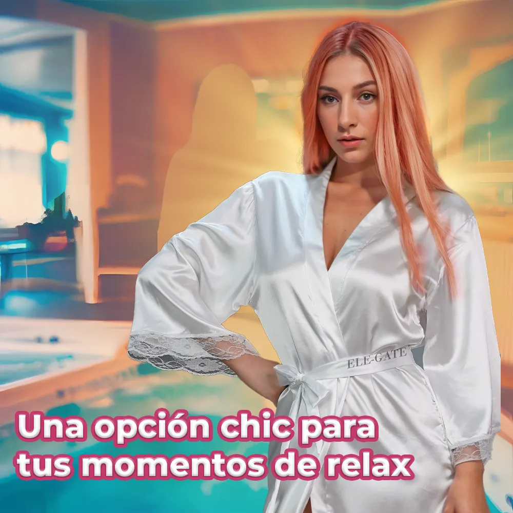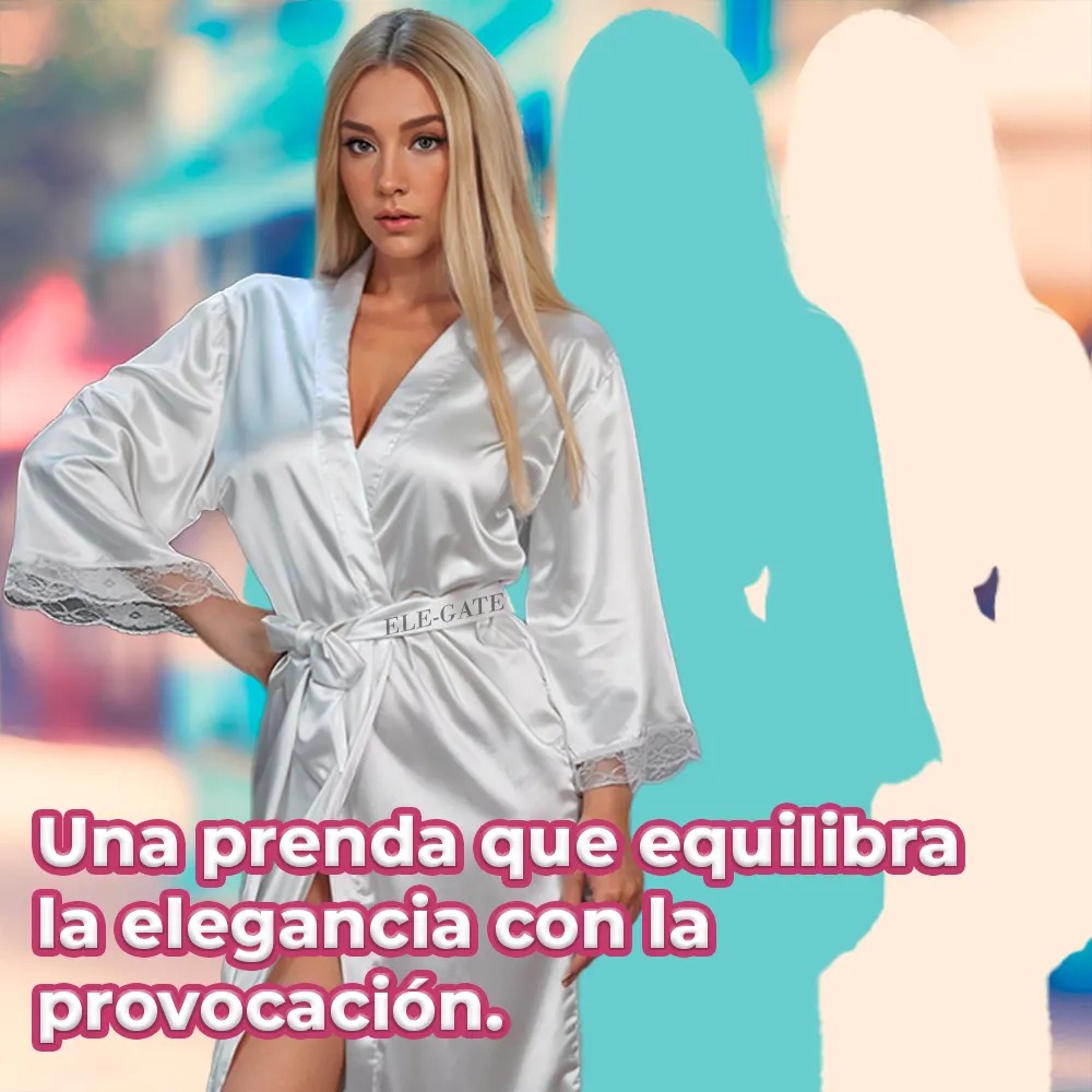 Detalle de encaje delicado: El encaje delicado adornando los bordes de la bata añade un toque de feminidad y sensualidad, creando un contraste encantador con la suavidad de la seda y agregando un elemento de intriga visual.