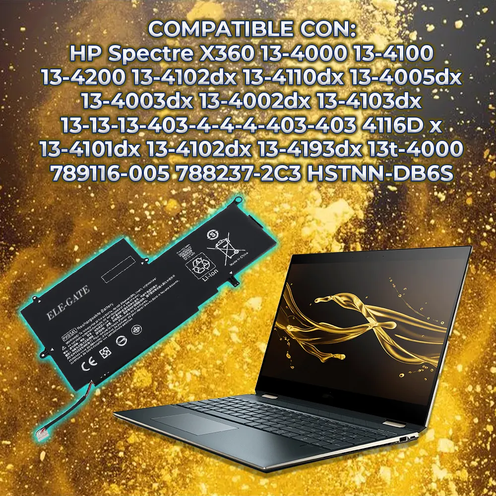 Batería de Litio Compatible con Hp para Laptop Spectre 4913MaH 56W 11.4V con 800 a 500 ciclos compatible con la serie X360 G1 G2 13 4000. Con alta taza de reciclaje para que cada carga aumente las horas de uso de tu laptop. Ideal para darle una mayor vida útil a tus equipos