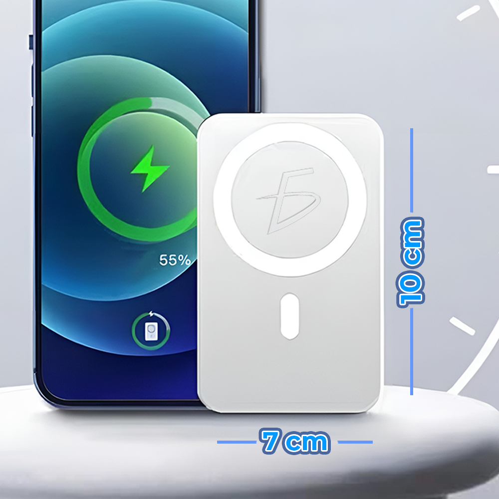 Lleva la potencia contigo con la Batería Inalámbrica Magnética de 5000 mAh , diseñada para ofrecer carga rápida, segura y sin cables. Gracias a su tecnología MagSafe, se acopla de forma magnética a tu teléfono para garantizar una carga constante y alineada.