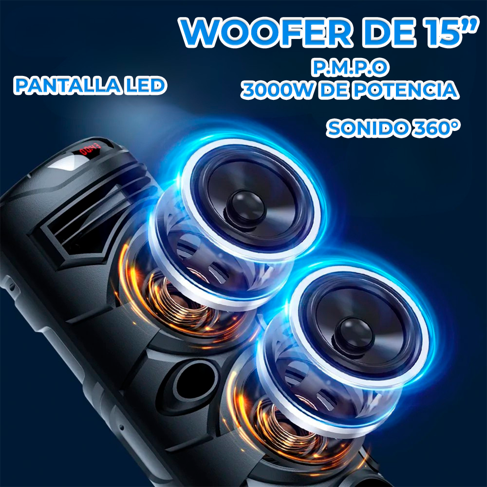 Lleva tu música a otro nivel con esta bocina Bluetooth de triple altavoz de 15 pulgadas y potencia máxima de 3000 W, diseñada para ofrecer un sonido profundo, claro y envolvente. Perfecta para fiestas, reuniones, karaoke o eventos al aire libre, esta bocina combina potencia, portabilidad y duración.
