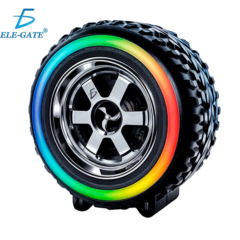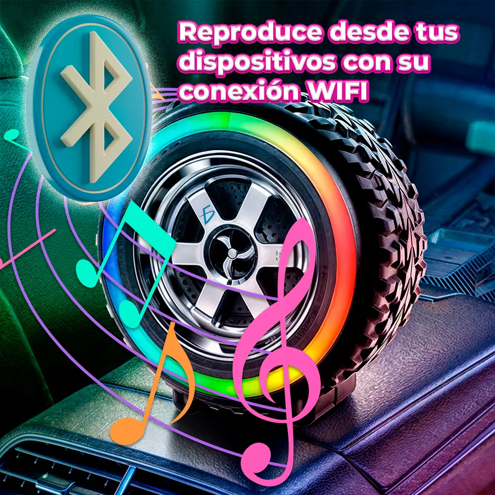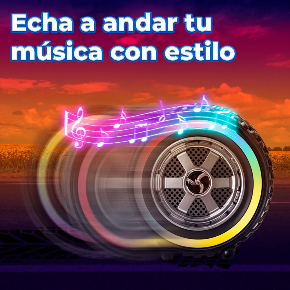 Bocina en Forma de Llanta Bluetooth RGB carga Tipo C. Sonido envolvente y 5 modos de luz RGB logrando una atmosfera en cualquier parte donde quieras escuchar tus canciones favoritas.