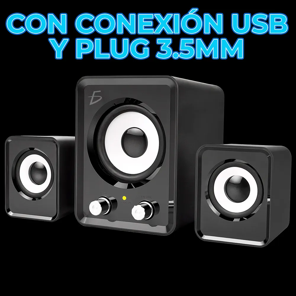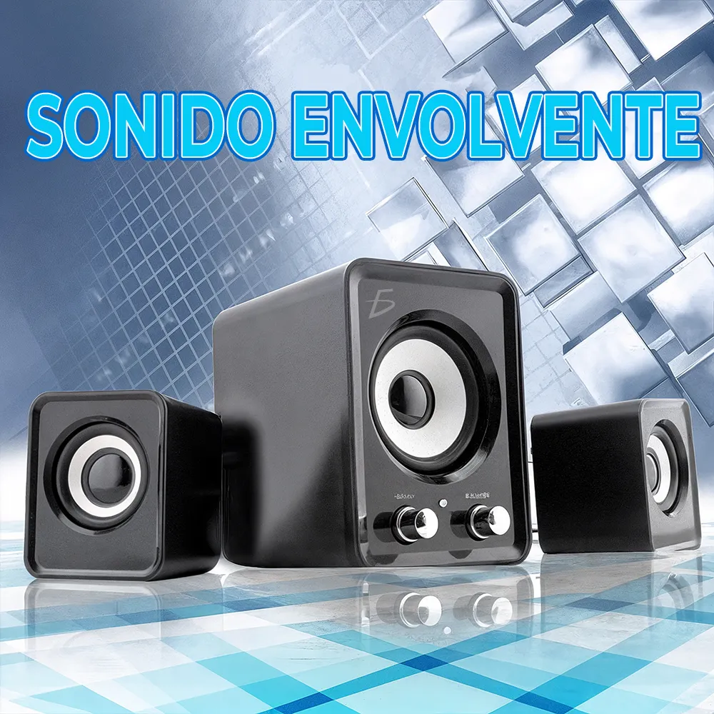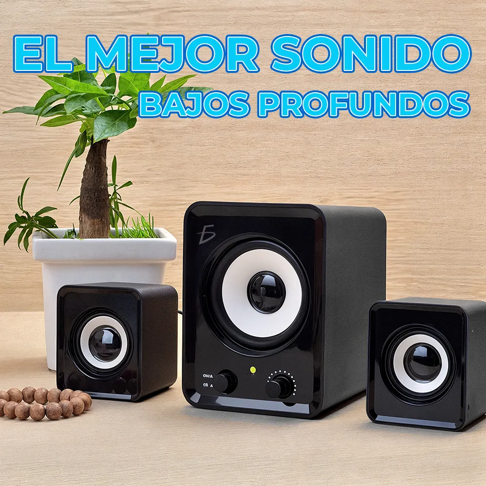 Sonido 2.1: Combina un subwoofer para graves profundos con dos bocinas para agudos y medios, ofreciendo una experiencia auditiva más rica y completa que un sistema de sonido monoaural o estéreo simple.