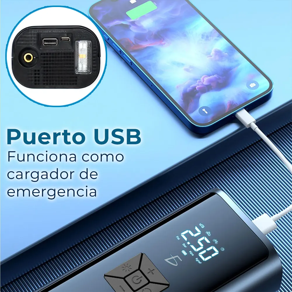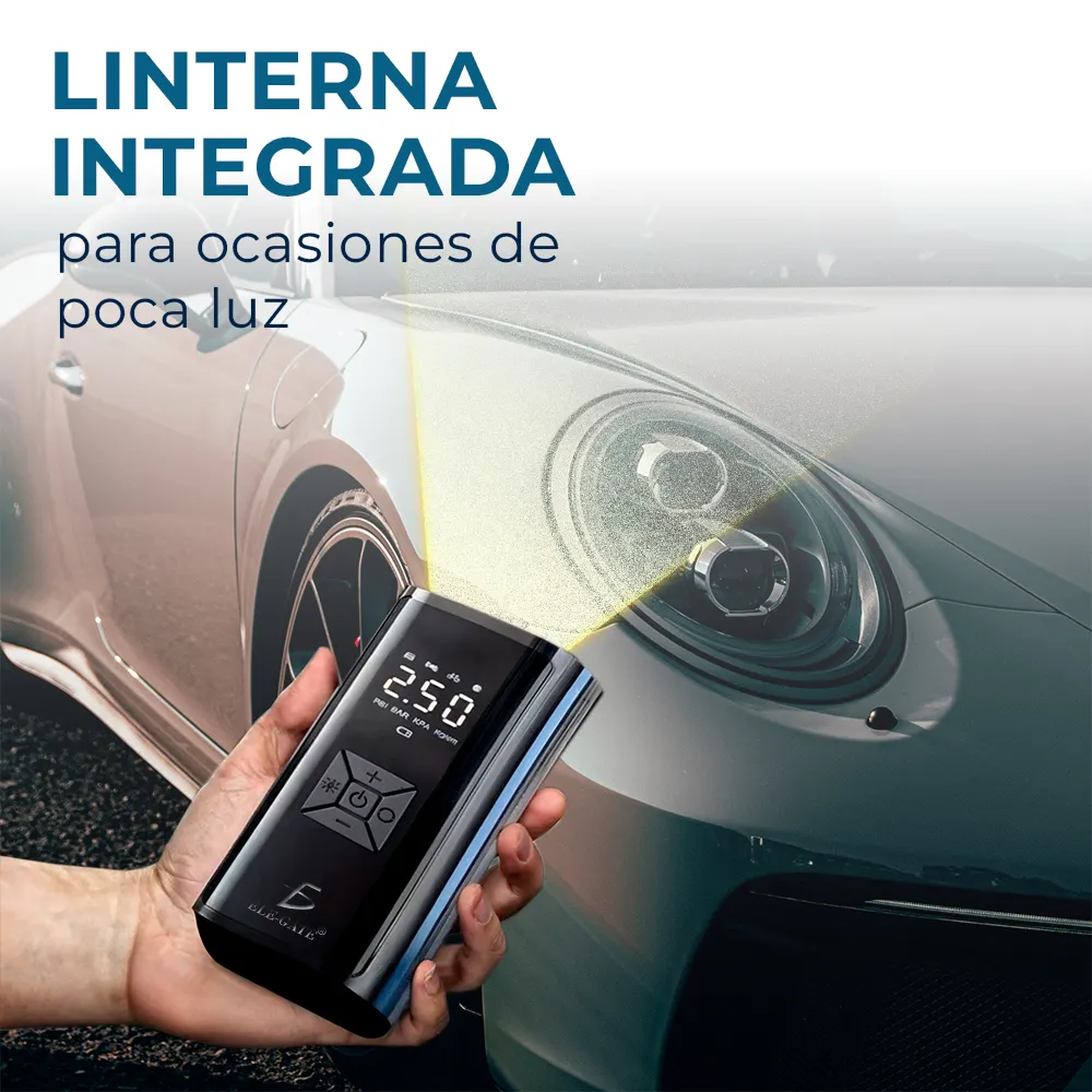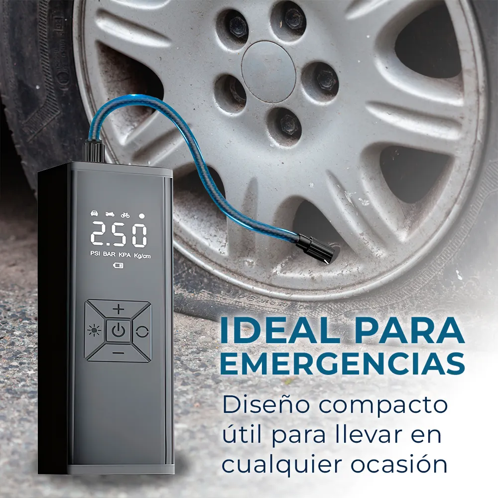 - Batería eléctrica potente: Ofrece una carga duradera que garantiza inflar neumáticos rápidamente sin necesidad de estar conectado a una fuente de energía externa.
