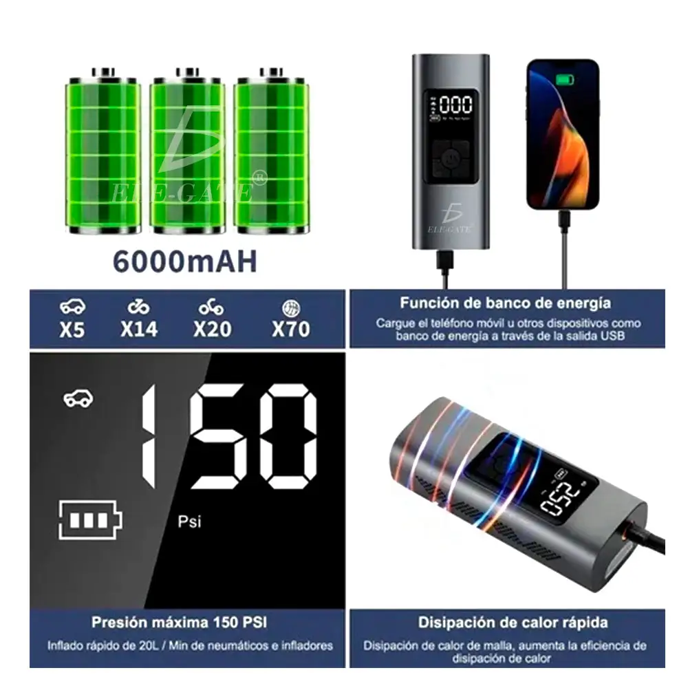 Inflador de llantas inalámbrica tiene una batería grande incorporada de 6000 mAh, inflador de llantas también tiene una función de fuente de alimentación móvil, inflador de llantas que puede cargar fácilmente el dispositivo, y no es necesario conectar el cable de carga al conducir el neumático. Inflador de llantas el potente motor mejorado puede proporcionar un inflado de neumáticos más rápido en solo unos minutos, hasta 150PSI.