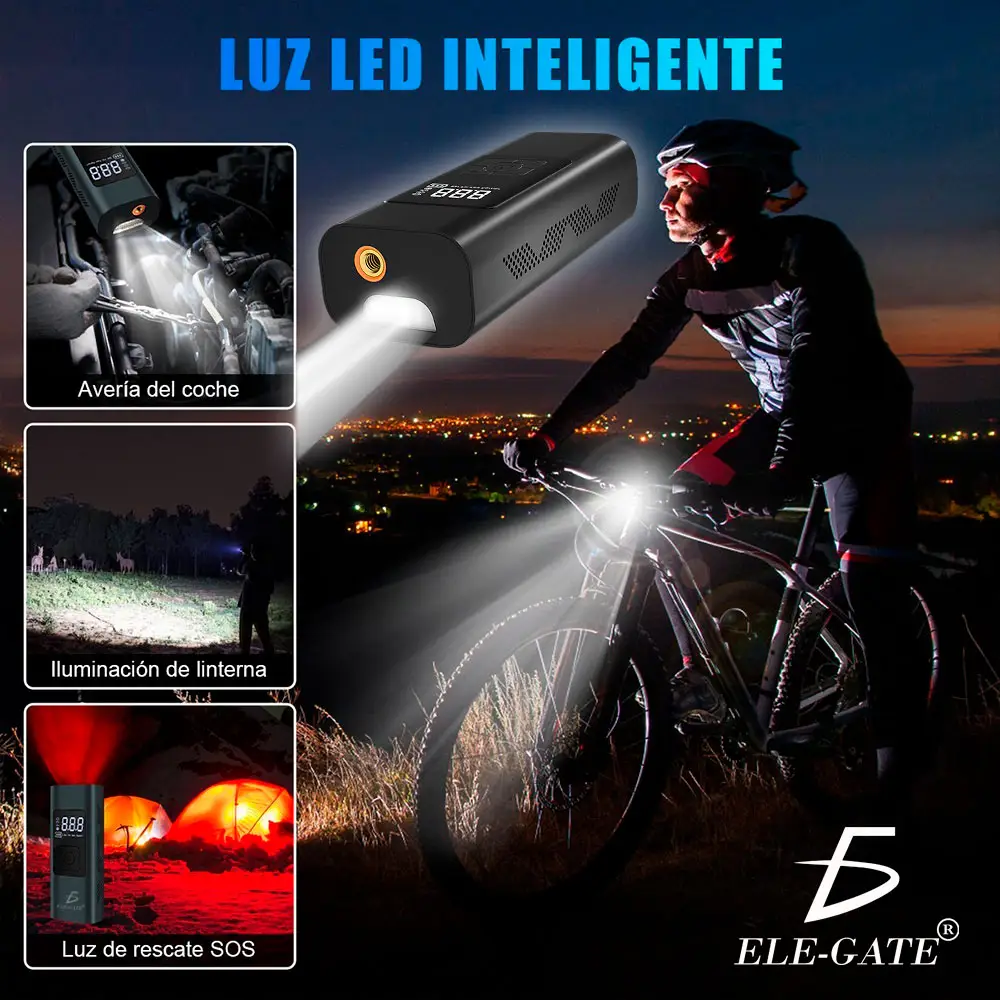Compresor para inflador de llantas portatil neumáticos adopta un diseño ergonómico y portátil, equipado con una pantalla LCD digital y luces LED súper brillantes. Inflador de llantas las luces LED incorporadas pueden ayudarlo a usarlo como iluminación de emergencia o alarma SOS en lugares oscuros, inflador de llantas para que esté de noche. También se puede ver claramente al rellenar neumáticos o al realizar reparaciones rápidas inflador de llantas en carreteras rurales remotas y oscuras.