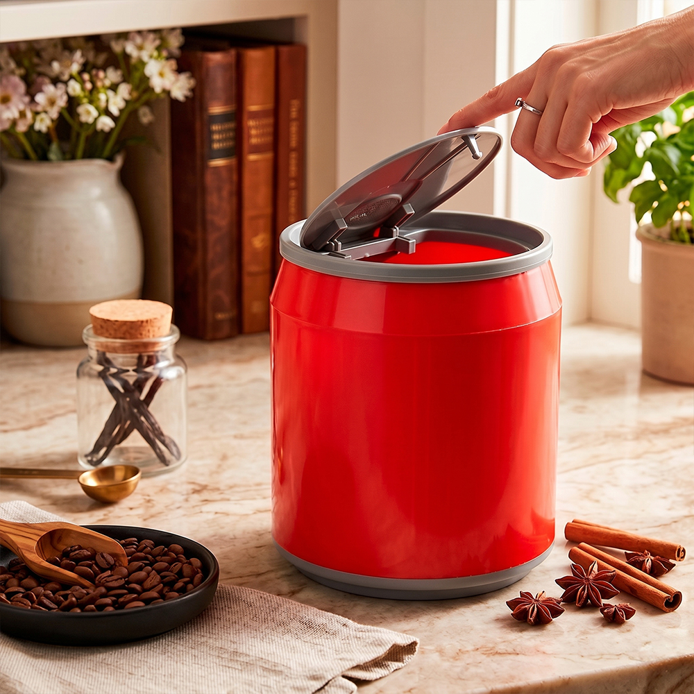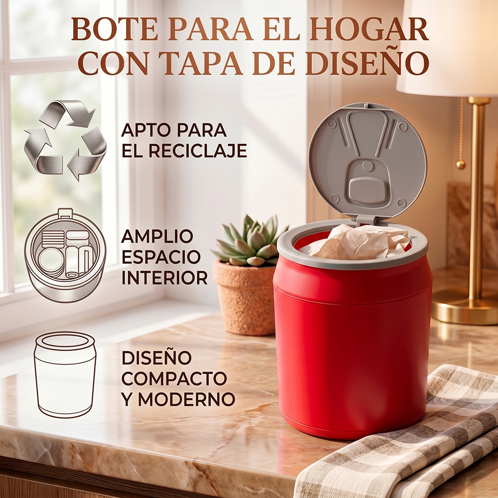 Su diseño cilíndrico inspirado en una lata de refresco no solo es visualmente atractivo, sino que también ofrece estabilidad y aprovechamiento eficiente del espacio. Además, está disponible en varios colores, lo que facilita su integración en cocinas, baños, oficinas o áreas comunes.