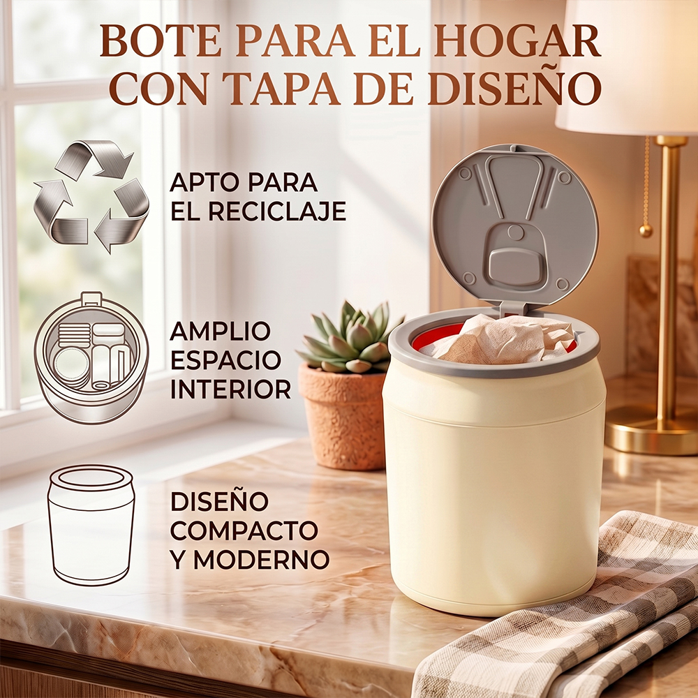 Mantén tus espacios limpios con este bote de basura de 9 litros con diseño tipo lata de refresco, ideal para quienes buscan funcionalidad sin sacrificar estilo.