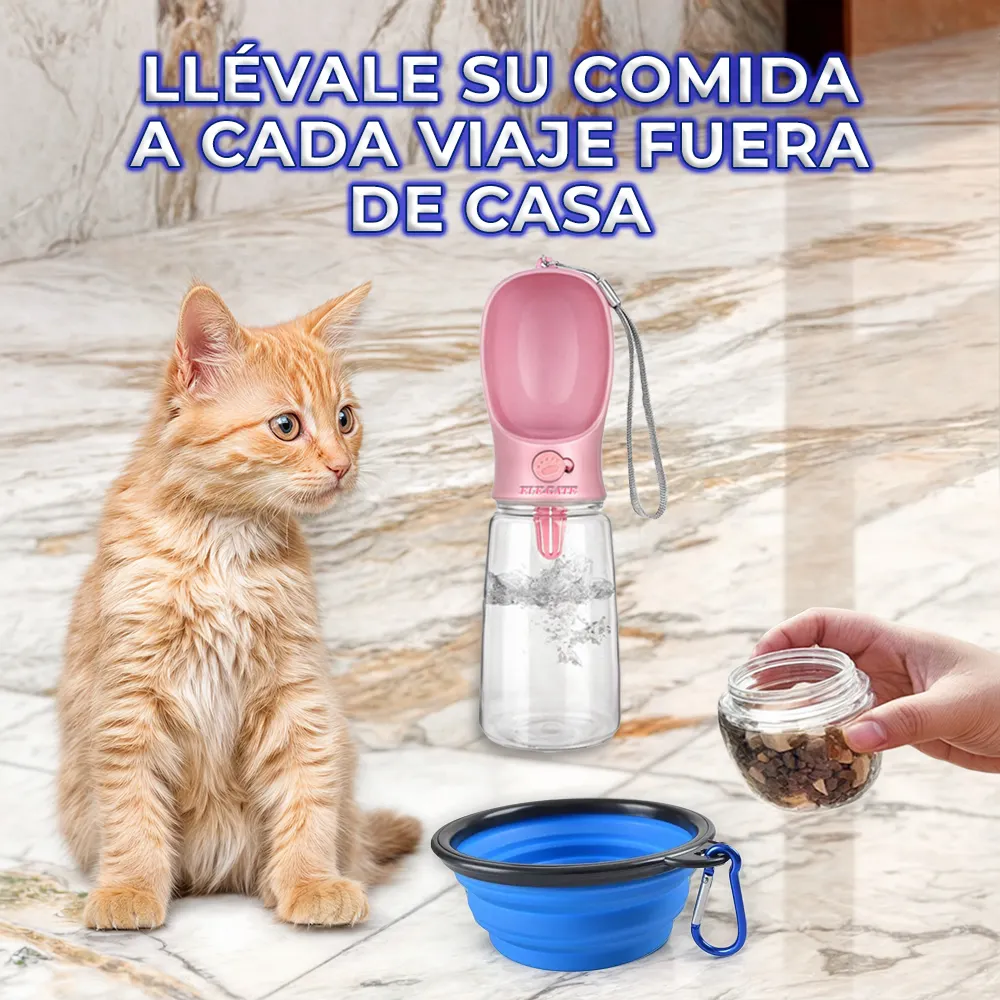 - Diseño 2 en 1: Dispensador de agua y compartimento para croquetas integrados en una sola botella.