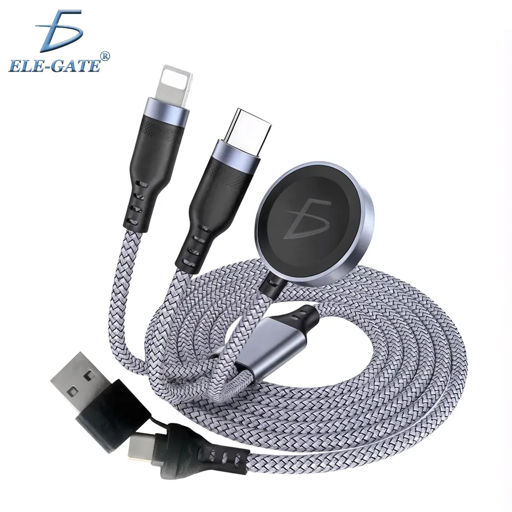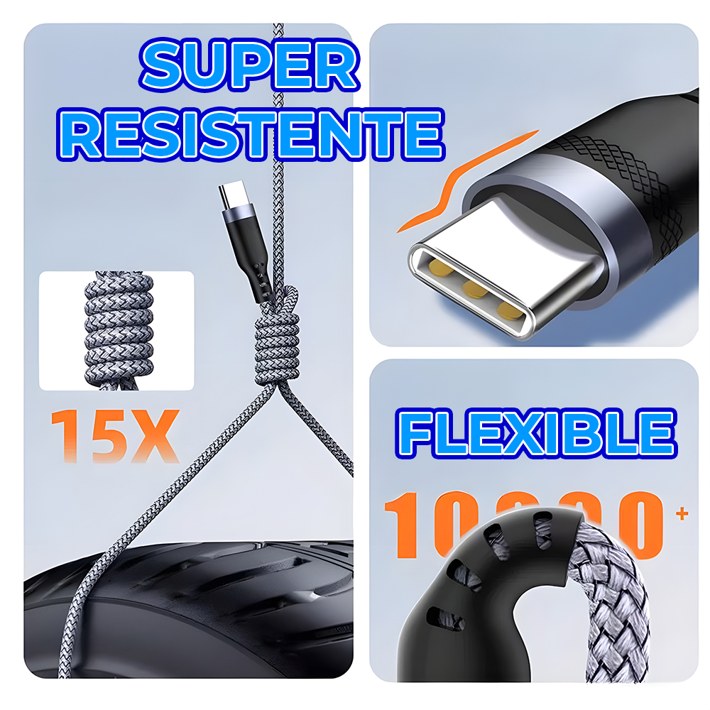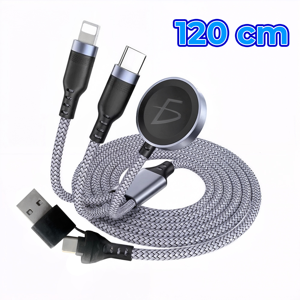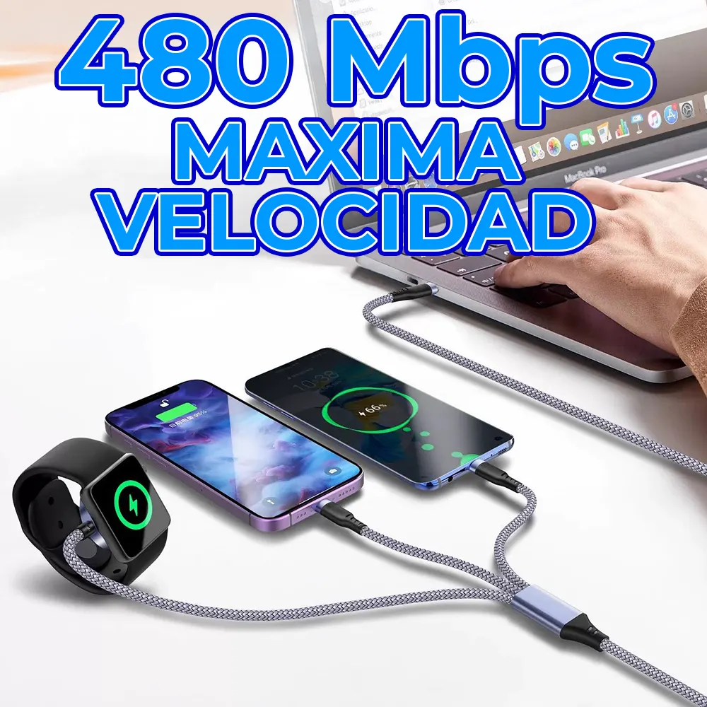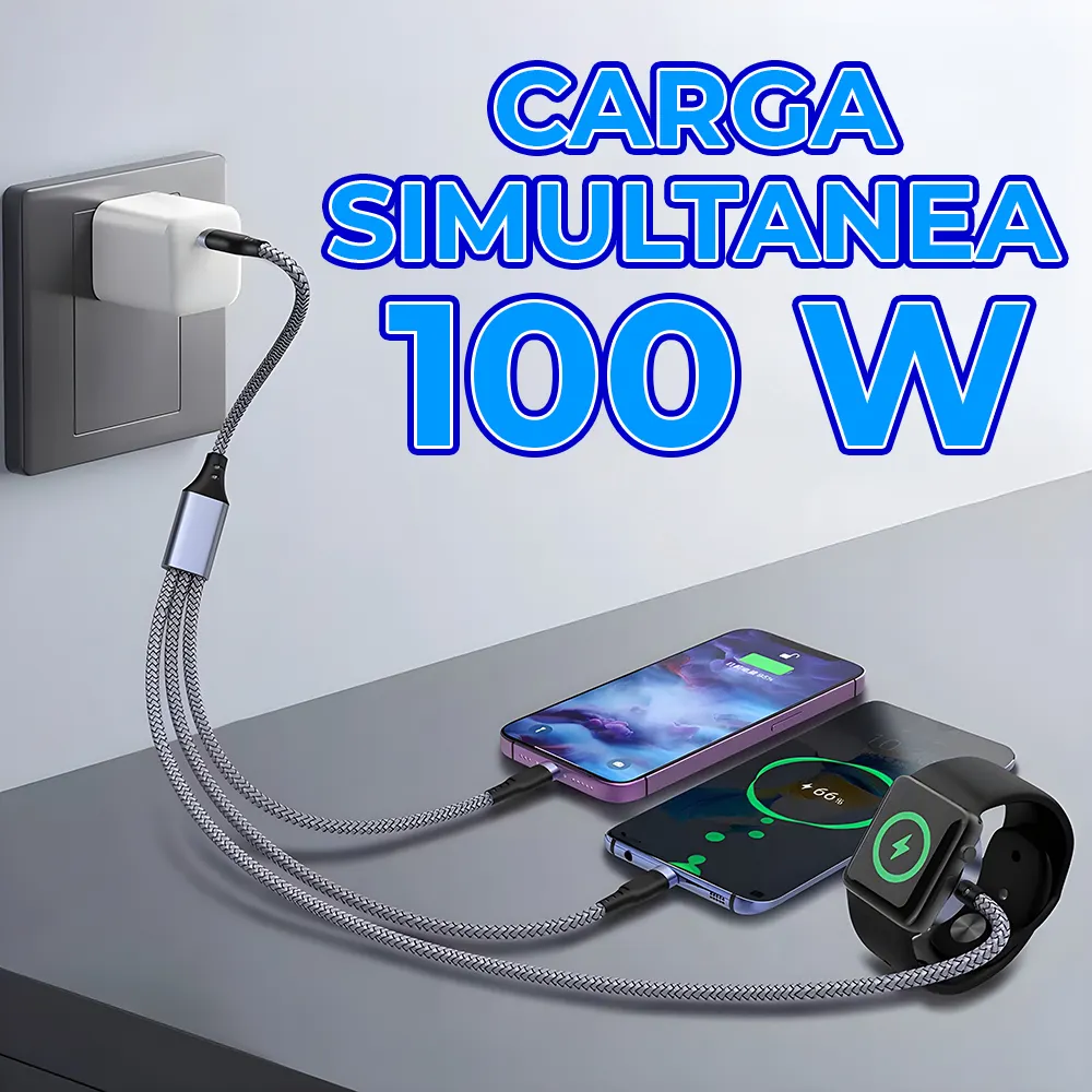 El modelo 2 en 3 integra conectores USB + Tipo C + Puerto para Apple Watch + Puerto para iPhone, permitiendo cargar hasta tres dispositivos al mismo tiempo. Ideal para quienes buscan practicidad, potencia y orden en un solo cable.