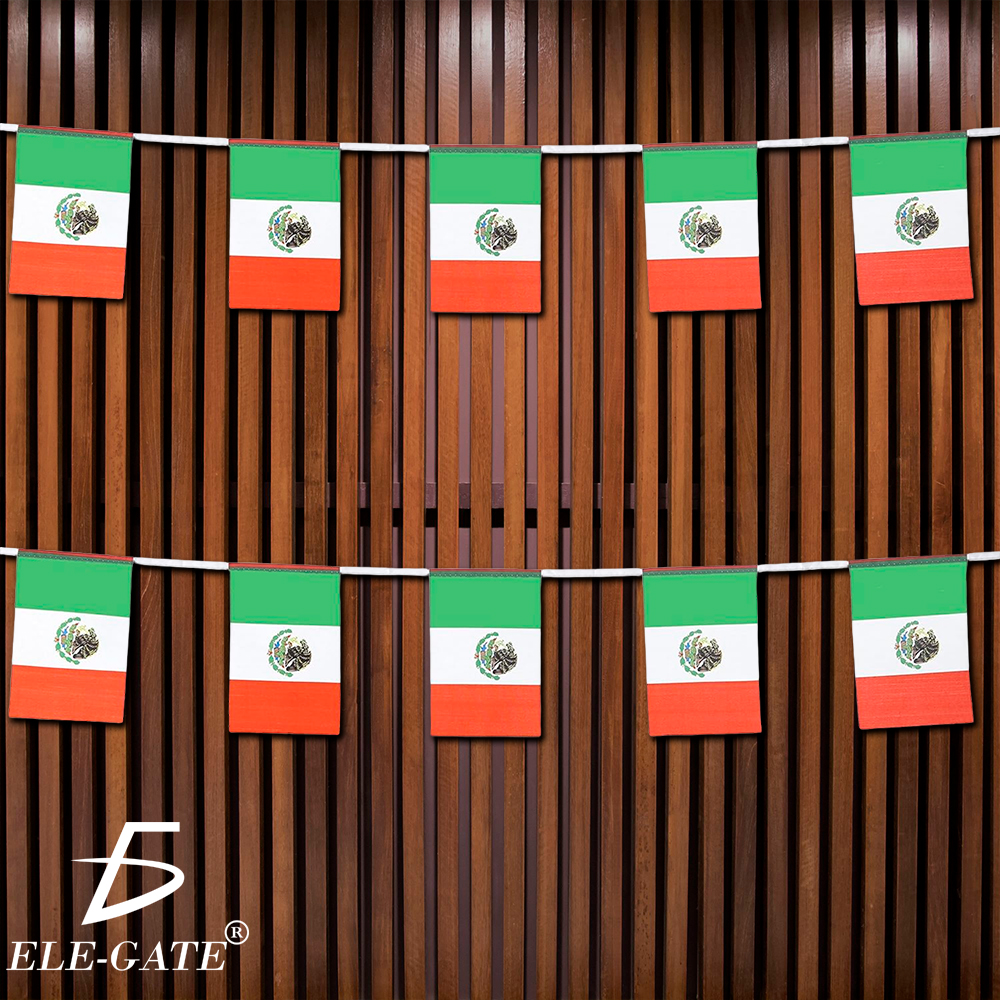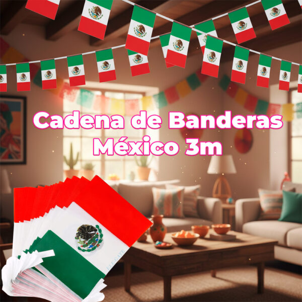 Decora tus espacios con orgullo y estilo con esta cadena de banderas de México 🇲🇽 de 3 metros de largo. Incluye 10 banderas de 15×20 cm fabricadas en tela tipo poliéster resistente, ideales para interiores y exteriores.