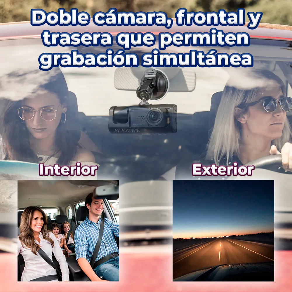 - Videocámara Dual: Captura simultáneamente lo que sucede en la carretera y dentro del coche, ideal para supervisar a los pasajeros o registrar cualquier incidente en el vehículo.