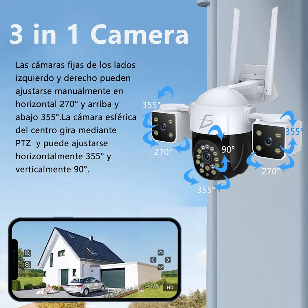 Triple cámara 4MP HD para vigilancia sin puntos ciegos.