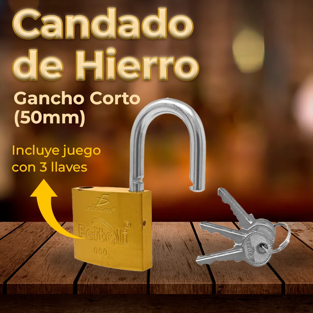 Candado de hierro con gancho corto y acabado dorado, ideal para asegurar cajones, maletas, casilleros y más. Fabricado con cuerpo de hierro altamente durable, garantiza resistencia y larga vida útil. Su mecanismo ofrece bloqueo y desbloqueo suave, e incluye juego de 3 llaves estándar. De fácil instalación y tamaño compacto de 50 mm, es perfecto para aplicaciones de seguridad ligera con estilo.