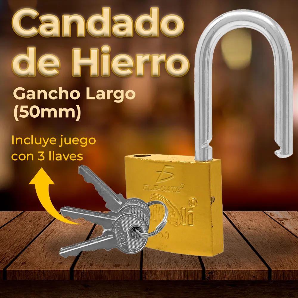 Candado de hierro con gancho largo y elegante acabado dorado, ideal para asegurar mochilas, puertas, casilleros o cajas con mayor margen de alcance. Su cuerpo de hierro altamente durable ofrece gran resistencia al uso diario. Con bloqueo y desbloqueo suave, es práctico y confiable. Incluye juego de 3 llaves estándar. De tamaño compacto de 50 mm, es fácil de instalar y transportar.
