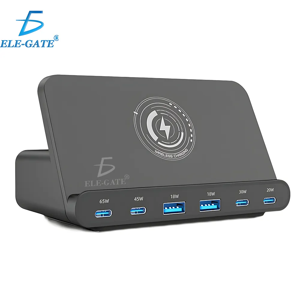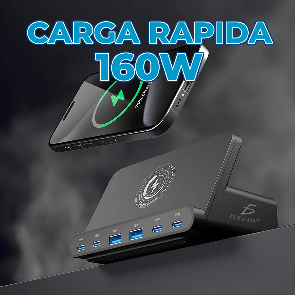 Cargador de Escritorio 7 en 1 160W con 6 Puertos de Carga 2 USB de 18W 1 C 20W 1C 30W 1C 45W y 1C 65W Con Carga Rápida Inalámbrica de 15W. Gracias a su tecnología y a su chip inteligente siempre tendrás el mismo flujo de carga en los 7 conexiones al mismo tiempo.