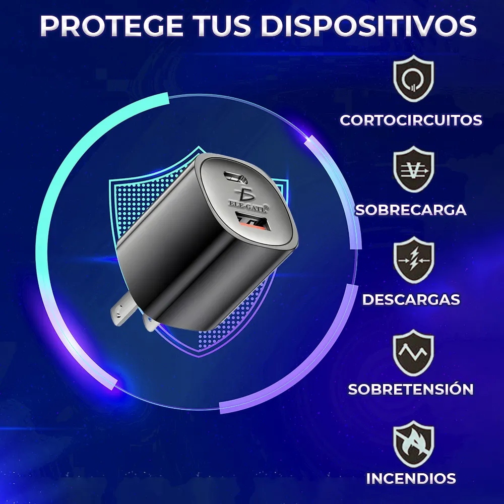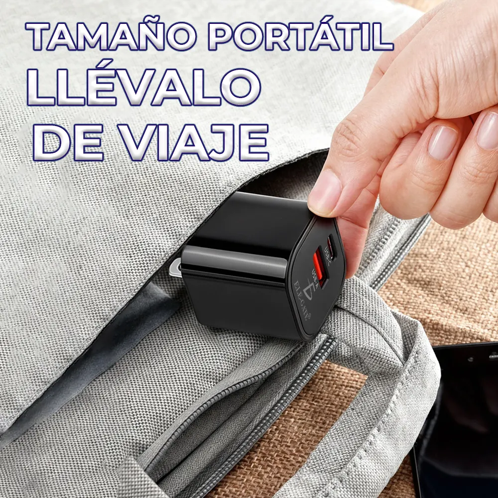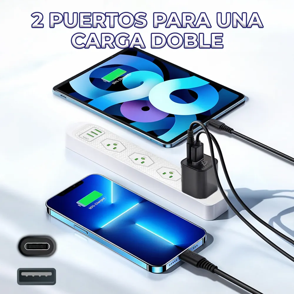 Cuadro de Carga Rápida Dos en Uno con Entrada USB A y Tipo C de 5V. Su tamaño compacto y liviano lo hacen ideal para llevarlo contigo y mantener siempre tus gadgets cargados y listos para usarse. Gracias a su chip inteligente siempre tendrás garantizadas cargas completas y rapidas sin sobrecargas ni sobrecalentamientos.