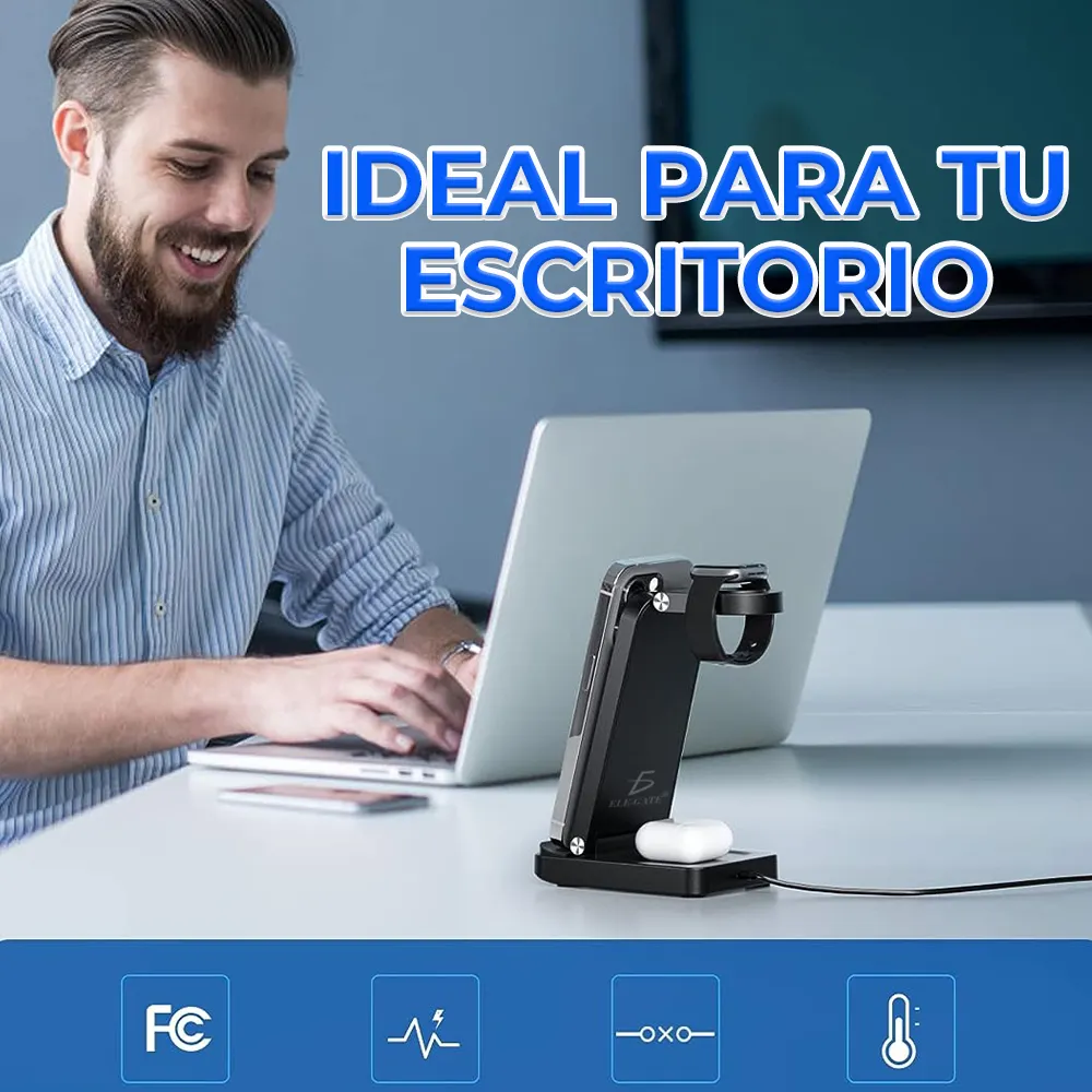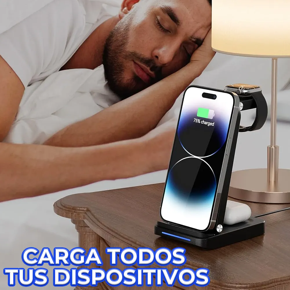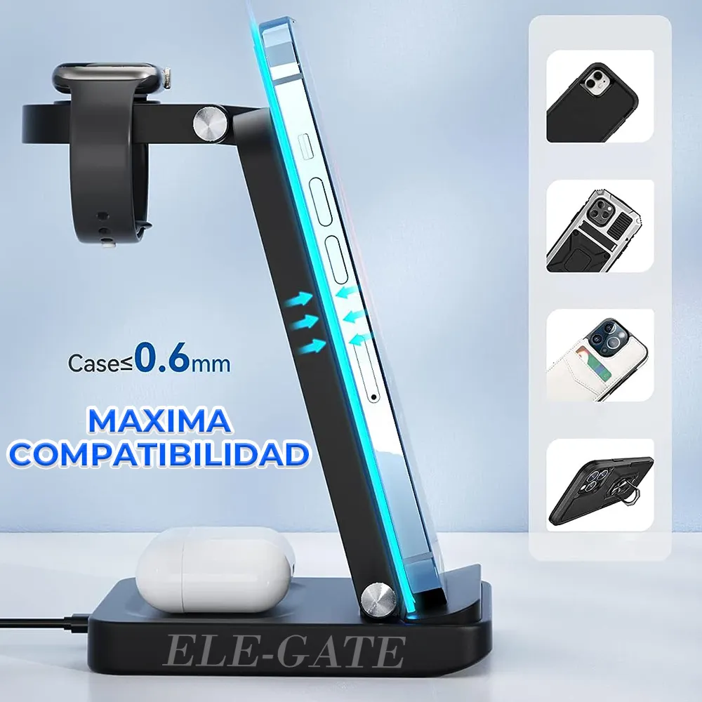 Optimiza tu espacio de carga con nuestro cargador inalámbrico 3 en 1 diseñado para dispositivos Apple. Este cargador te permite cargar simultáneamente tu iPhone, iWatch y AirPods, proporcionando una solución conveniente y eficiente.