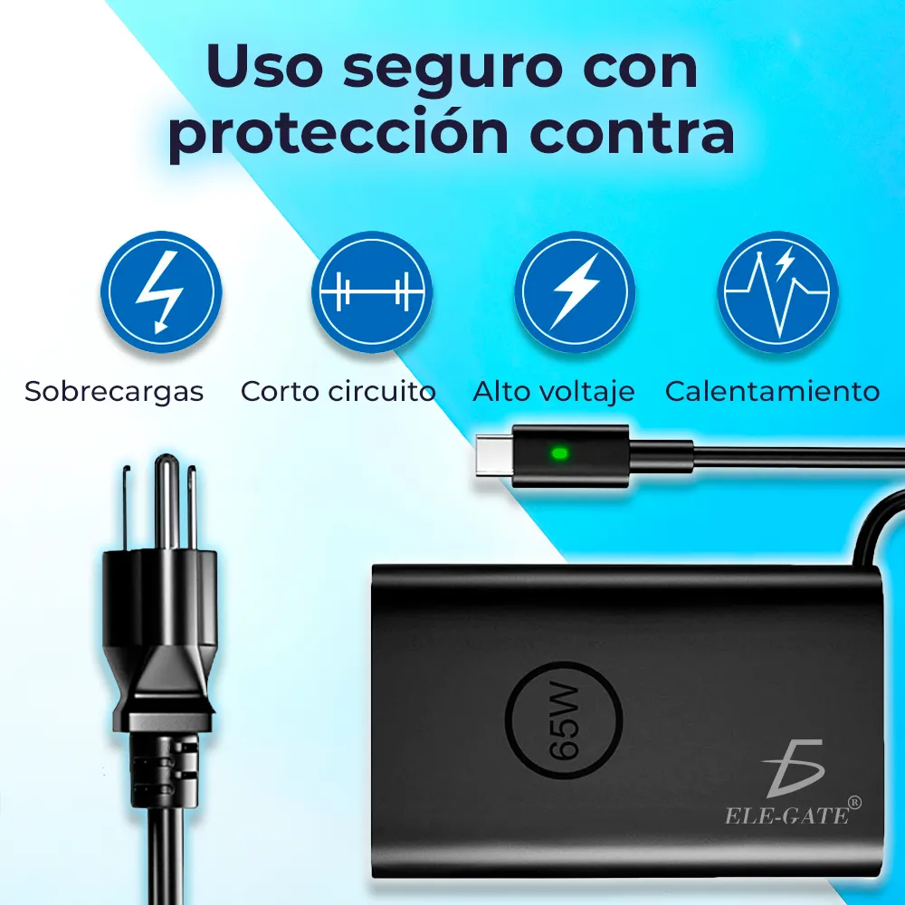Especificaciones técnicas: Este cargador tiene una entrada de 100-240V, 50-60Hz y una salida de 20V, 3.25A, proporcionando una potencia total de 65W. Su conector USB-C ofrece compatibilidad universal.