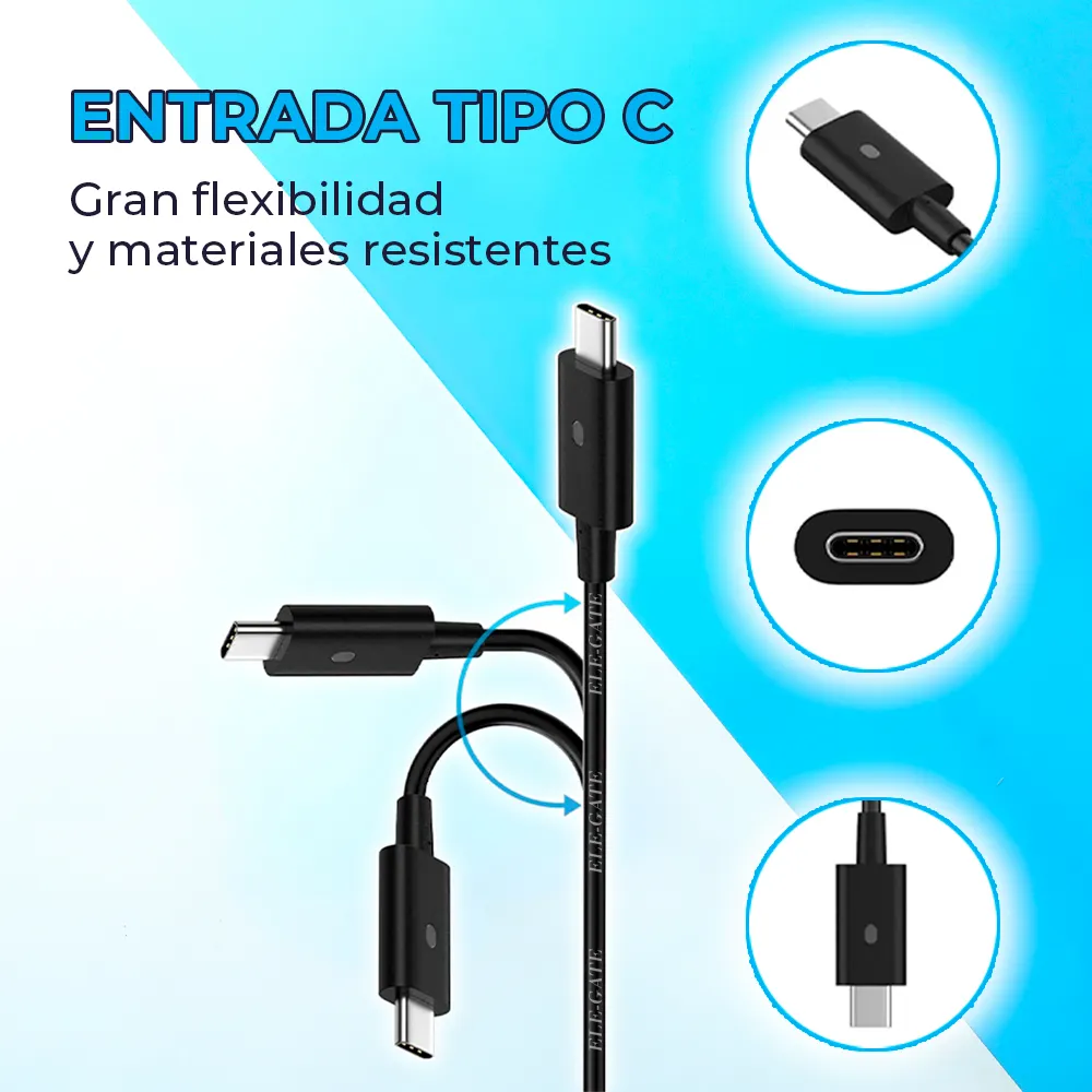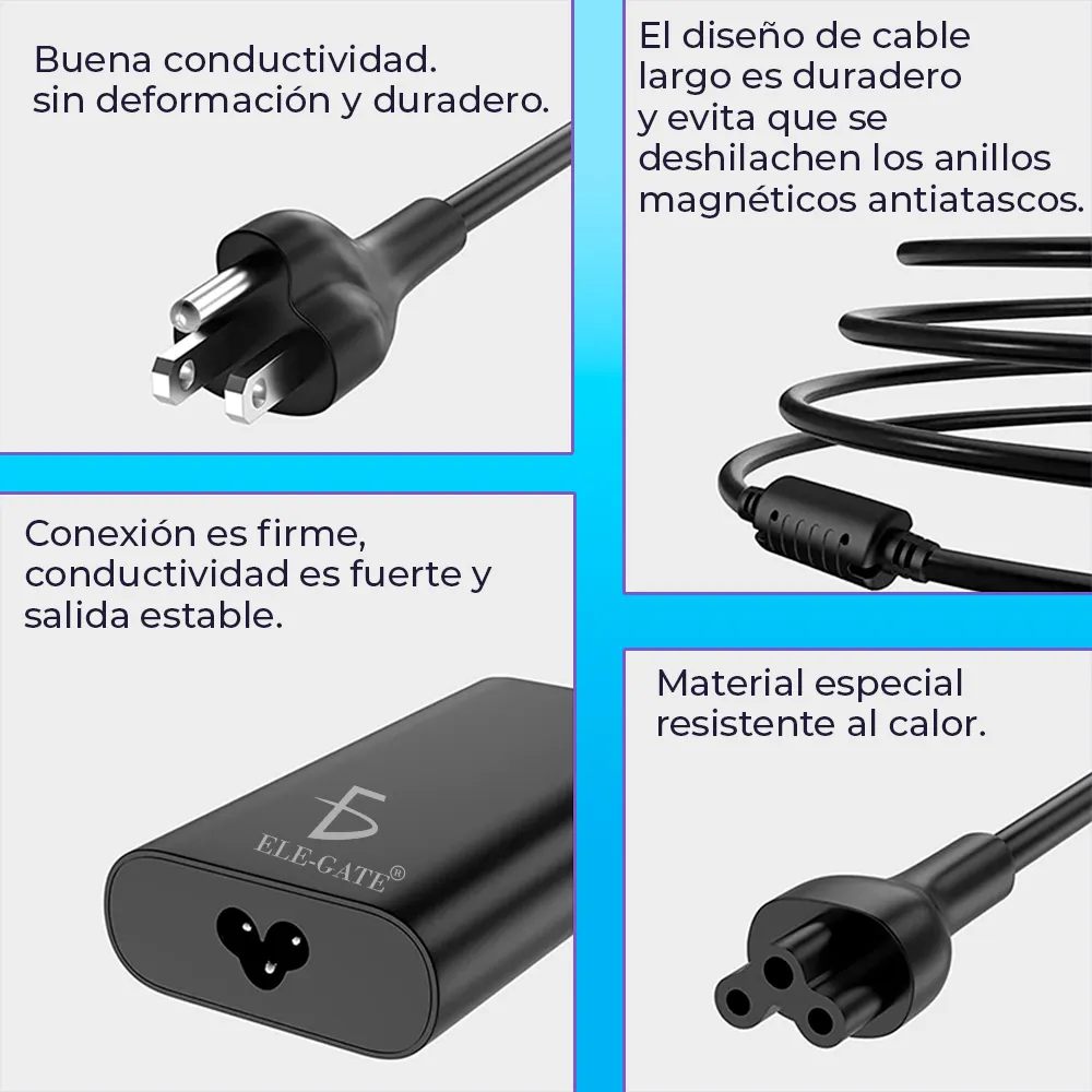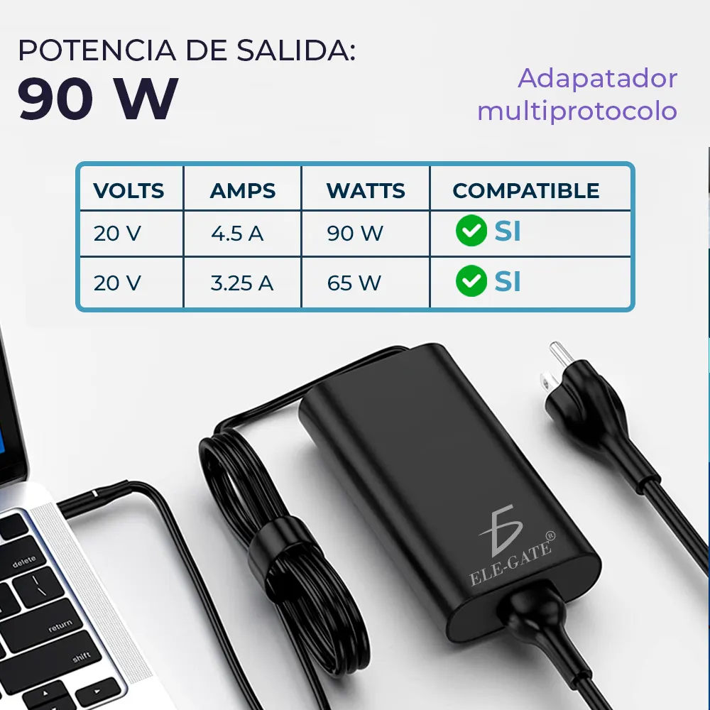 Especificaciones Técnicas: Este cargador tiene una entrada de 100-240V, 50-60Hz y ofrece una salida de 20V/5V, proporcionando una potencia total de 90W. Está equipado con un conector Tipo-C, asegurando una amplia compatibilidad.