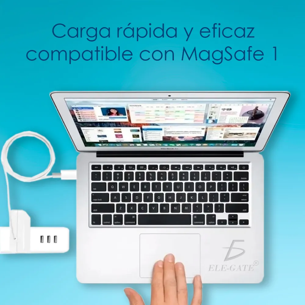 Cargador Compatible Mac Book Air 45W con MagSafe Tipo L 14.5V/3.1A 14.85V/3.05A 50-60Hz . LA LUZ LED PROPORCIONA INFORMACIÓN DE ESTADO: Una luz ámbar le permite saber que su portátil se está cargando, mientras que una luz verde le indica que tiene una carga completa