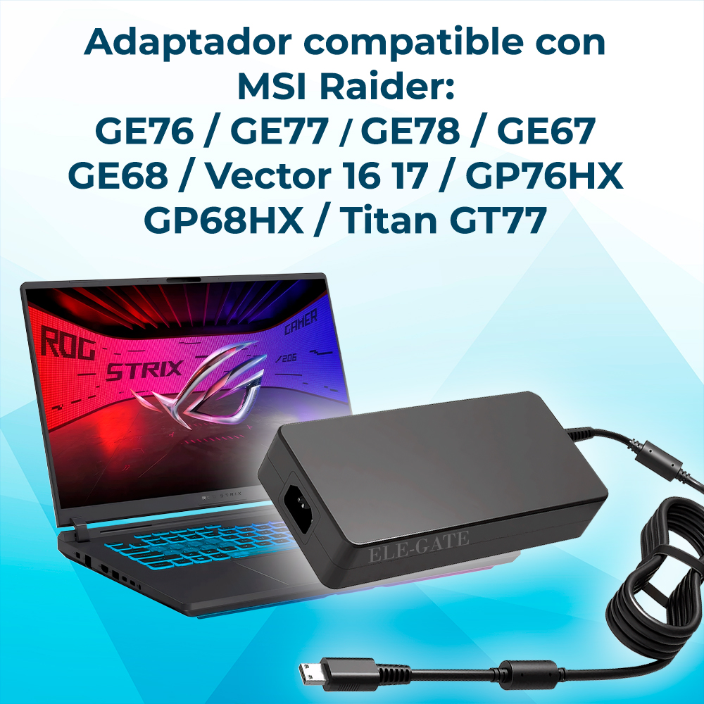 Cargador de alto rendimiento diseñado especialmente para laptops MSI CreatorPro y Gaming, ofreciendo potencia estable, carga segura y máxima compatibilidad con equipos de alto consumo energético.