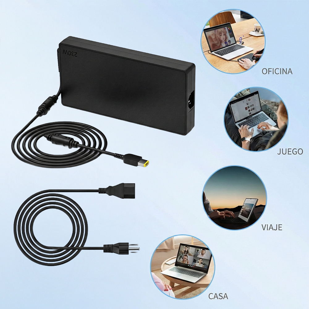 Adaptador de corriente de alto rendimiento compatible con laptops Lenovo que requieren 230W y conector cuadrado amarillo (Slim Tip). Ideal como reemplazo o cargador principal para estaciones de trabajo y equipos gaming.