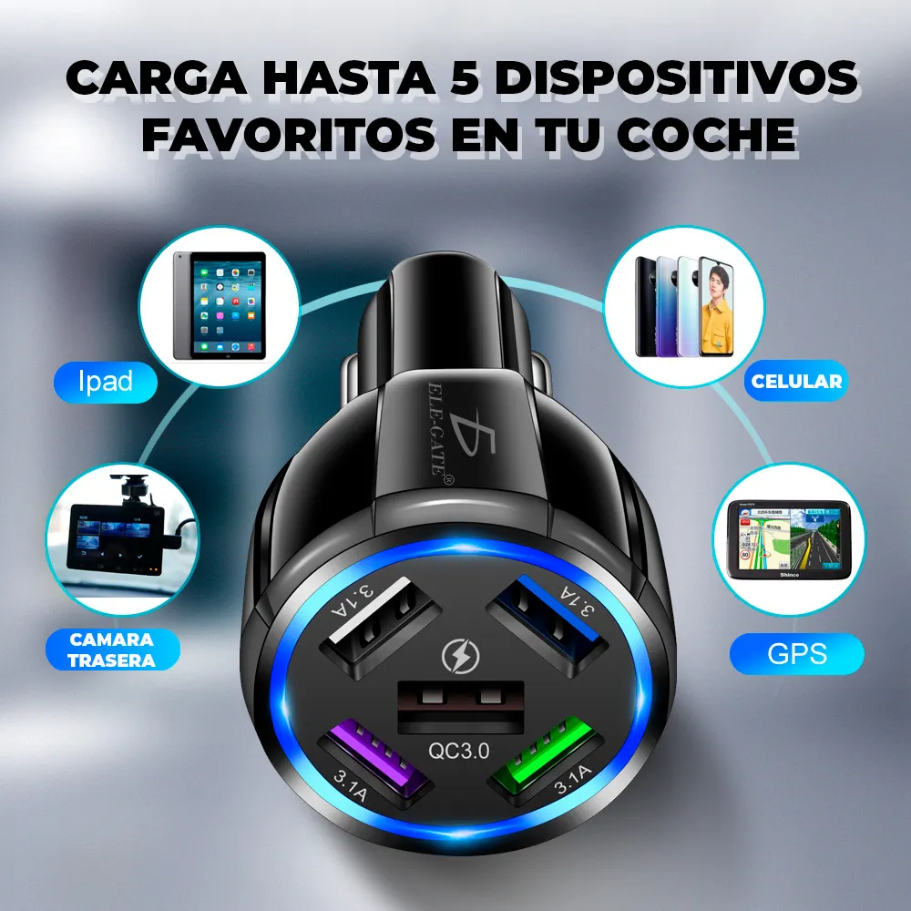 5 puertos: el cargador USB para coche tiene 5 puertos USB de alta potencia, que pueden satisfacer los requisitos de carga rápida.