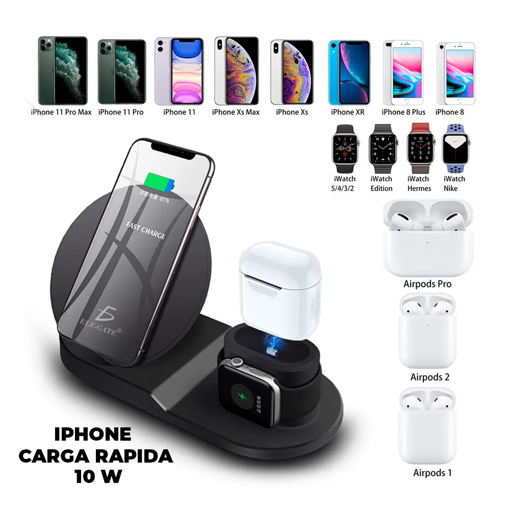 Esta base Cargador Inalámbrico Iphone AirPod esta Diseñada para dispositivos de carga inalámbrica como CELULARES, AUDIFONOS Y RELOJES INTELIGENTES con tecnología de carga inalámbrica (Qi).