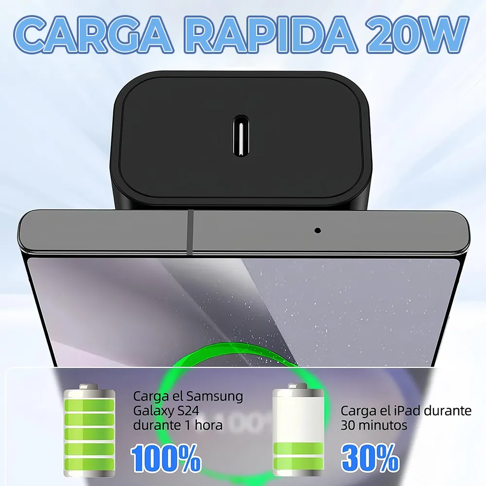 - Carga rápida de 20 W: Disfruta de una carga potente y veloz para tus dispositivos.