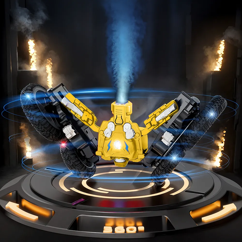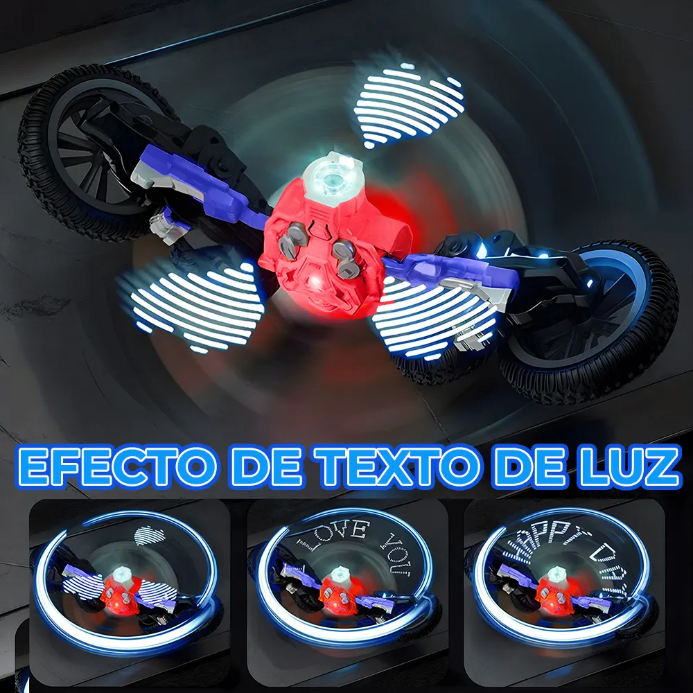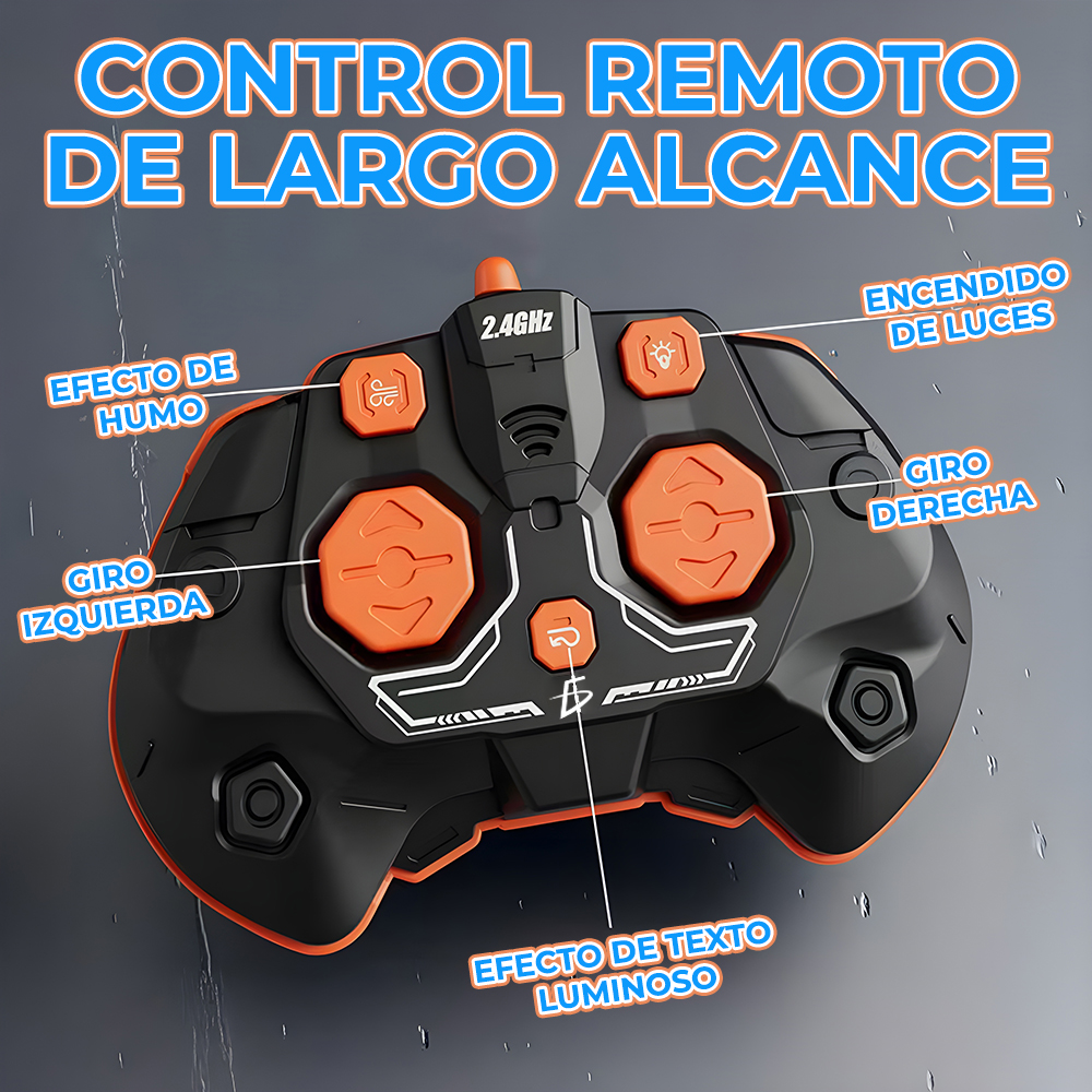 Prepárate para vivir una experiencia de velocidad, acrobacias y efectos visuales únicos! Este carro de control remoto combina un diseño moderno con giros de 360°, efectos luminosos avanzados y un impresionante spray trasero que simula humo. Gracias a su sistema de luces LED , puede formar figuras, iconos e incluso pequeñas frases, convirtiendo cada carrera en un espectáculo de colores y movimiento.