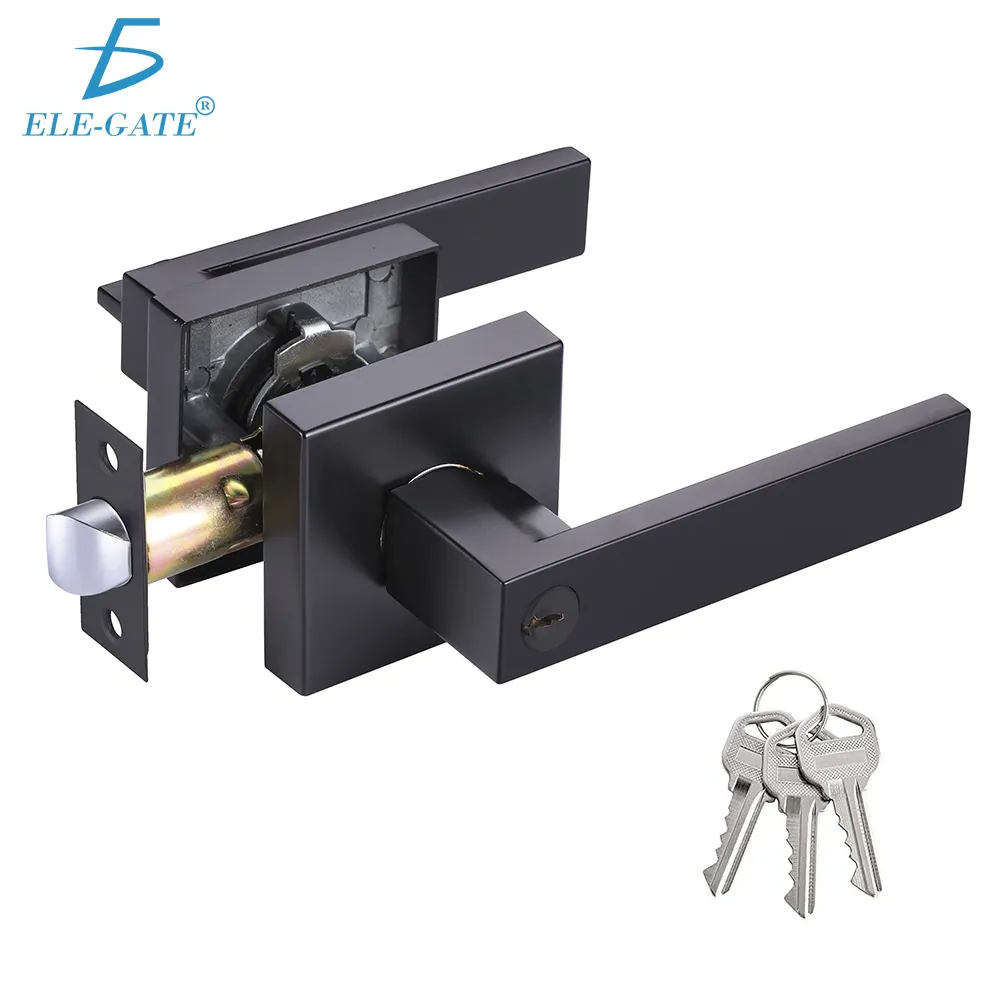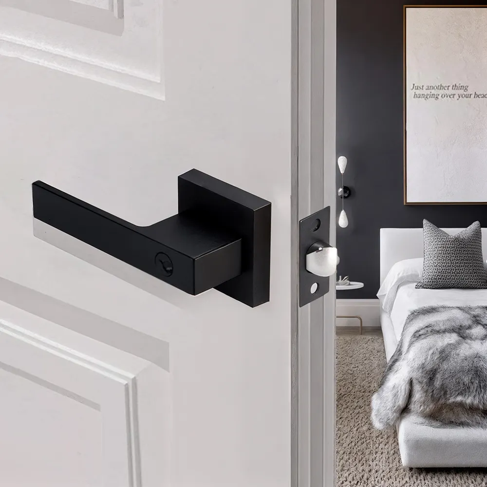 Cerradura de manija cuadrada negra de servicio pesado para recámara, con elegante acabado Negro. Diseñada para ofrecer alta seguridad y durabilidad, incluye cilindro de aleación de zinc con tapón de latón, y pestillo ajustable de 45° (60 mm o 70 mm). Totalmente reversible para puertas derechas o izquierdas, compatible con grosores de 1-3/8″ a 1-3/4″. Incluye 3 llaves niqueladas y opción de llave maestra o llave de construcción bajo pedido. Certificada bajo normas ANSI Grade 3, BHMA e ISO9001, con una vida útil de hasta 200,000 ciclos.