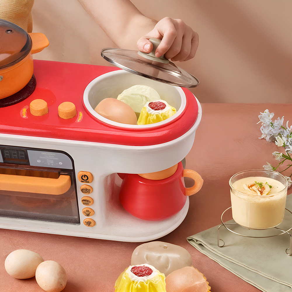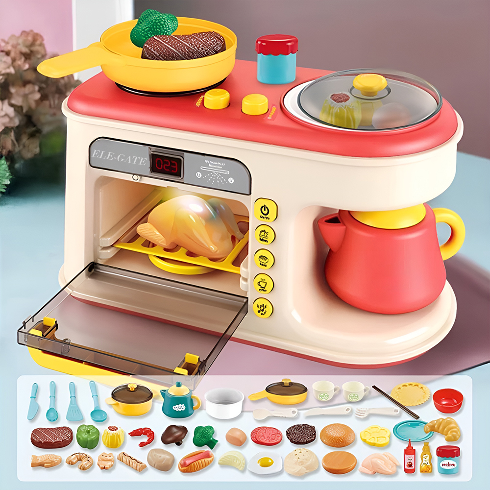 El Juego de Cocina Infantil con Luz, Música y Sonido ofrece una experiencia de simulación realista que encantará a los pequeños amantes de la cocina. Este set multifuncional de 47 piezas incluye todo lo necesario para preparar deliciosos platillos imaginarios: frutas, verduras, carnes, panes, tazas, utensilios y hasta una máquina de desayuno.