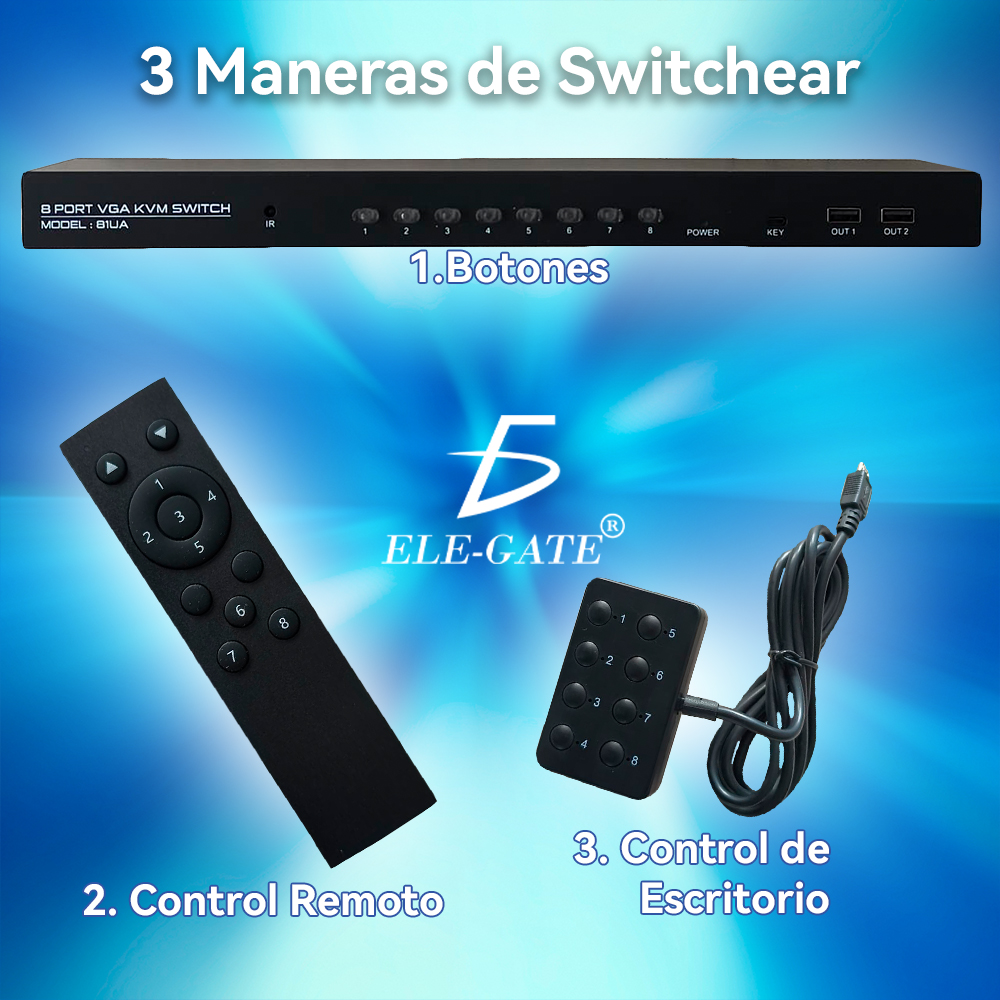 Este KVM Switch VGA de 8 puertos permite compartir 1 monitor VGA, 1 teclado, 1 mouse y hasta 4 dispositivos USB 2.0 entre 8 computadoras, ideal para oficinas, salas de control, aulas multimedia y entornos profesionales.