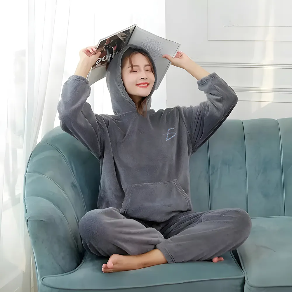 Conjunto de pijama mullido de 2 piezas para mujer: Sherpa suave y acogedora con capucha.