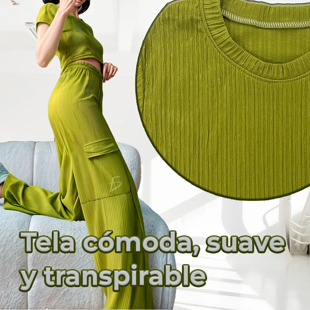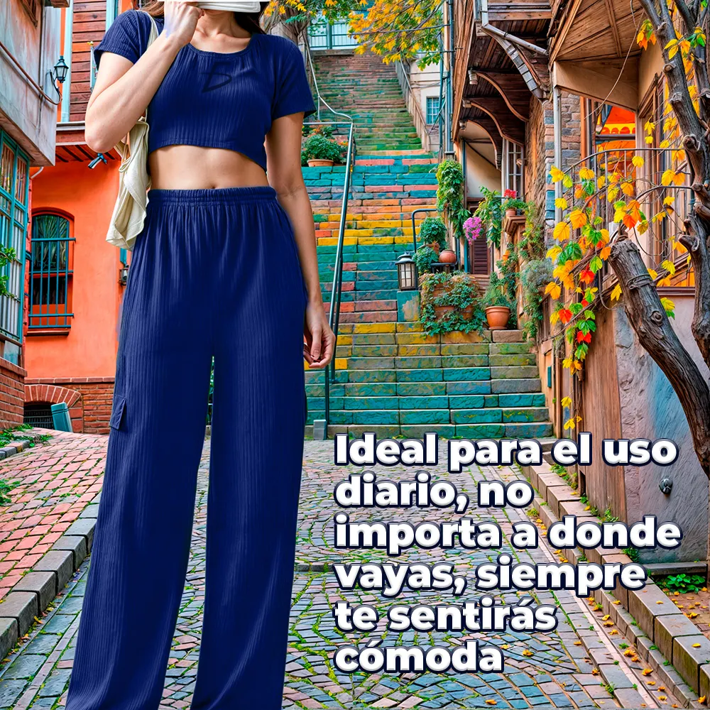 La playera ombliguera de manga corta añade un toque de frescura y coquetería al conjunto. Su diseño corto y ajustado resalta la figura y muestra un toque de piel, mientras que las mangas cortas brindan comodidad y libertad de movimiento. Además, el monocromatismo del conjunto crea una estética moderna y elegante.