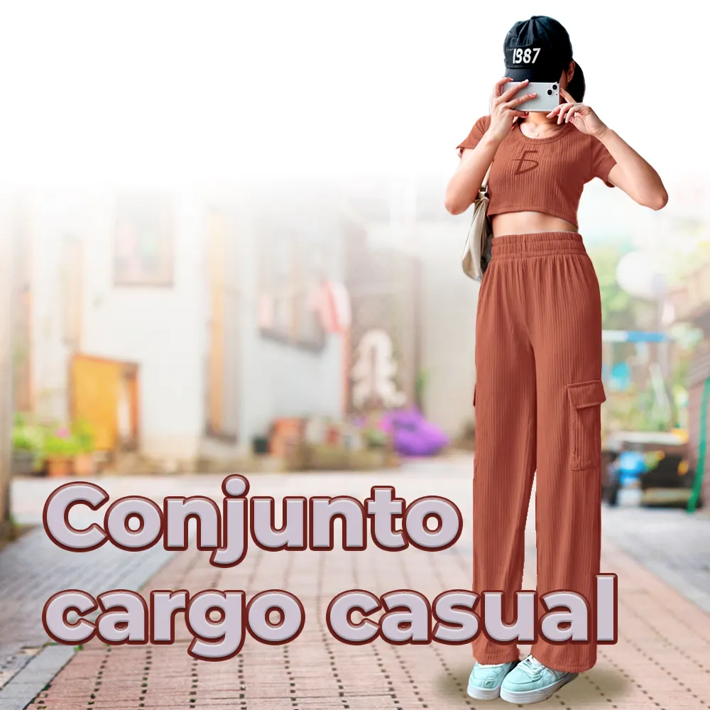 Trendy y Casual: Conjunto Monocromático con Pantalón Cargo y Playera Ombliguera de Manga Corta