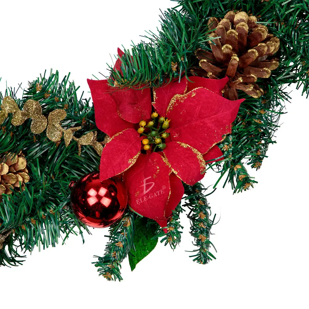 - Diseño Elegante: Las flores detalladas, las bolas decorativas y los racimos de frutas dan vida a esta corona, creando una decoración navideña elegante y atractiva.
