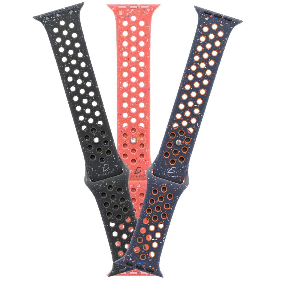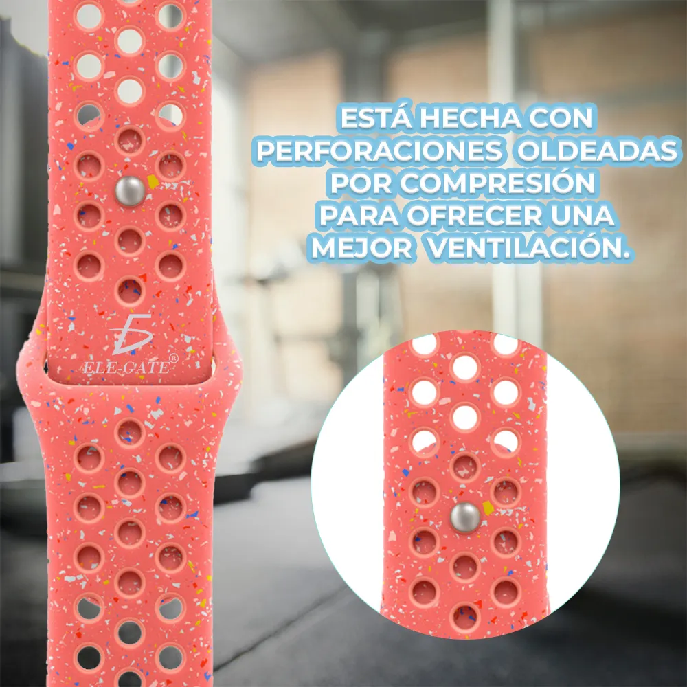Correa deportiva tipo Apple Watch de 38-41mm con Perforaciones moldeadas por compresión para ofrecer una mayor transpirabilidad. Fragmentos de colores que le dan a cada correa un toque único. Se ajusta a la perfección con un cierre de encastre. Ideal para llevar tu Smarth Watch a cualquier lado.